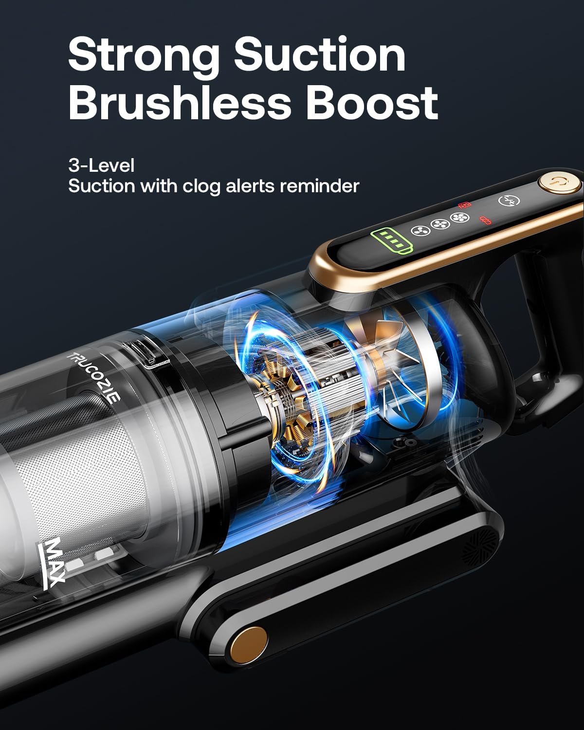 【45Kpa Powerful Suction & Multiple Settings】Enjoy the strong suction power of the brushless motor. With three wind speed settings, you can adjust the suction force as needed. And the clogging reminder keeps you informed of any possible blockages all the time