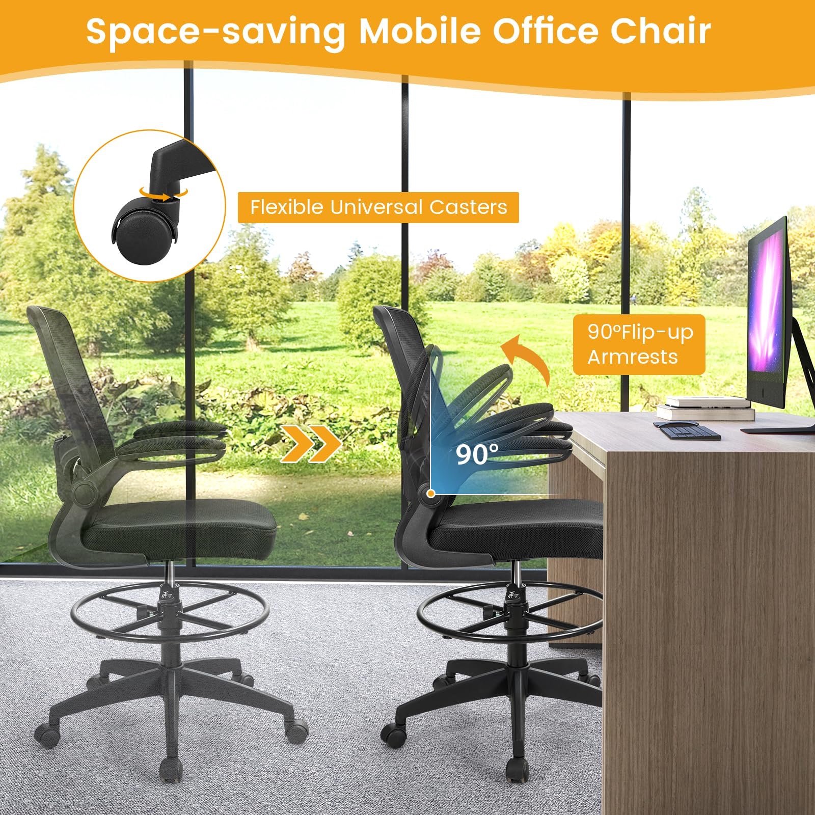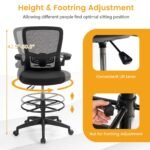 【Tall Office Chair with Adjustable Footrest】The seat height of this drafting chair can be adjusted from 22.5″ to 30.5″, which makes it easy to fit desks with different heights. Besides, the drafting chair also comes with a height-adjustable footrest ring (7.5″-13″), providing customized comfort for your legs and feet.