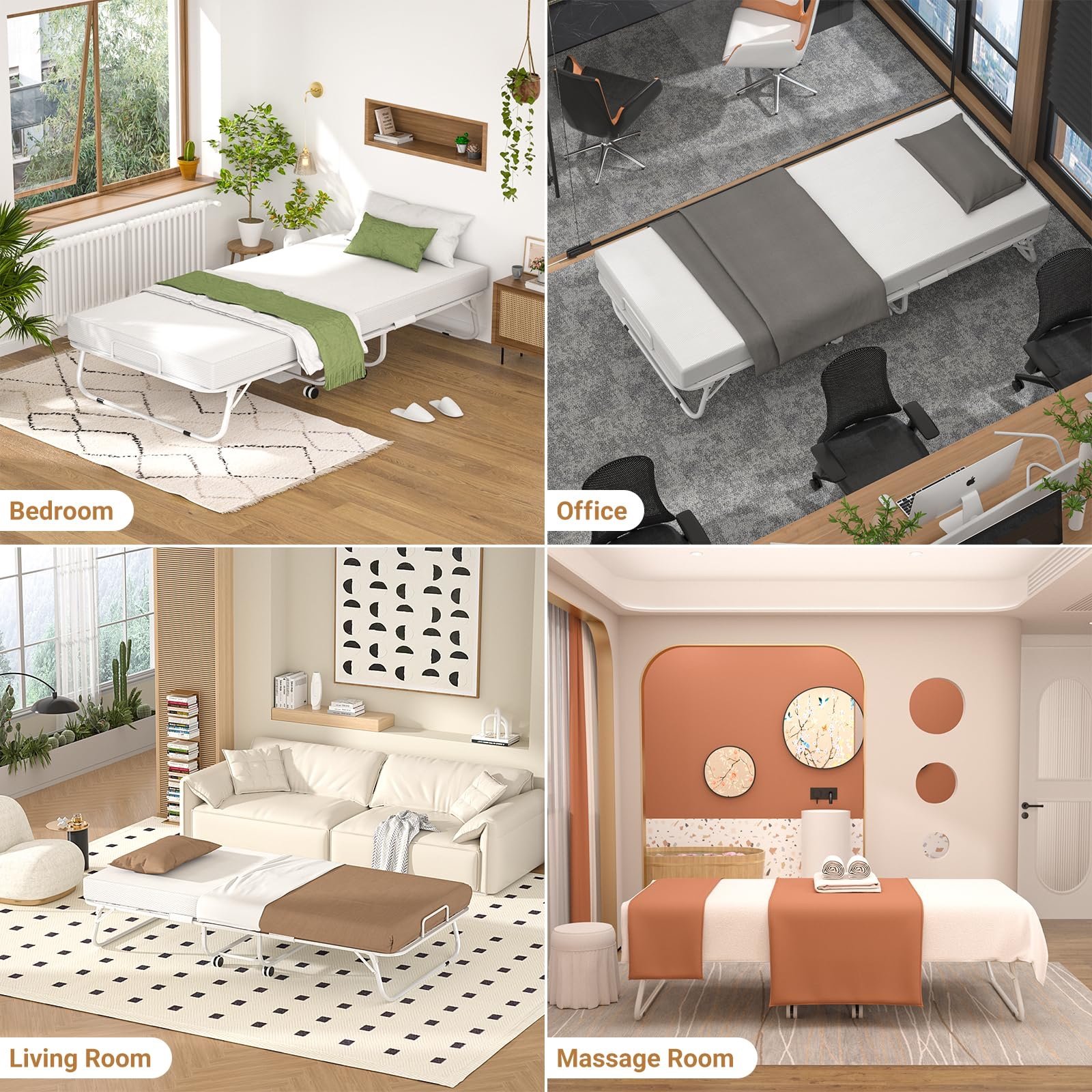 🌛【Twin Size Folding Bed for Small Space】: Wherever you are, office or loft or any small space, you can use this folding bed easily. When the bed is folded, only: 11.6” wide. It can be easily stored in the corner and is space-saving. Especially the bottom wheels can make you move it easily.