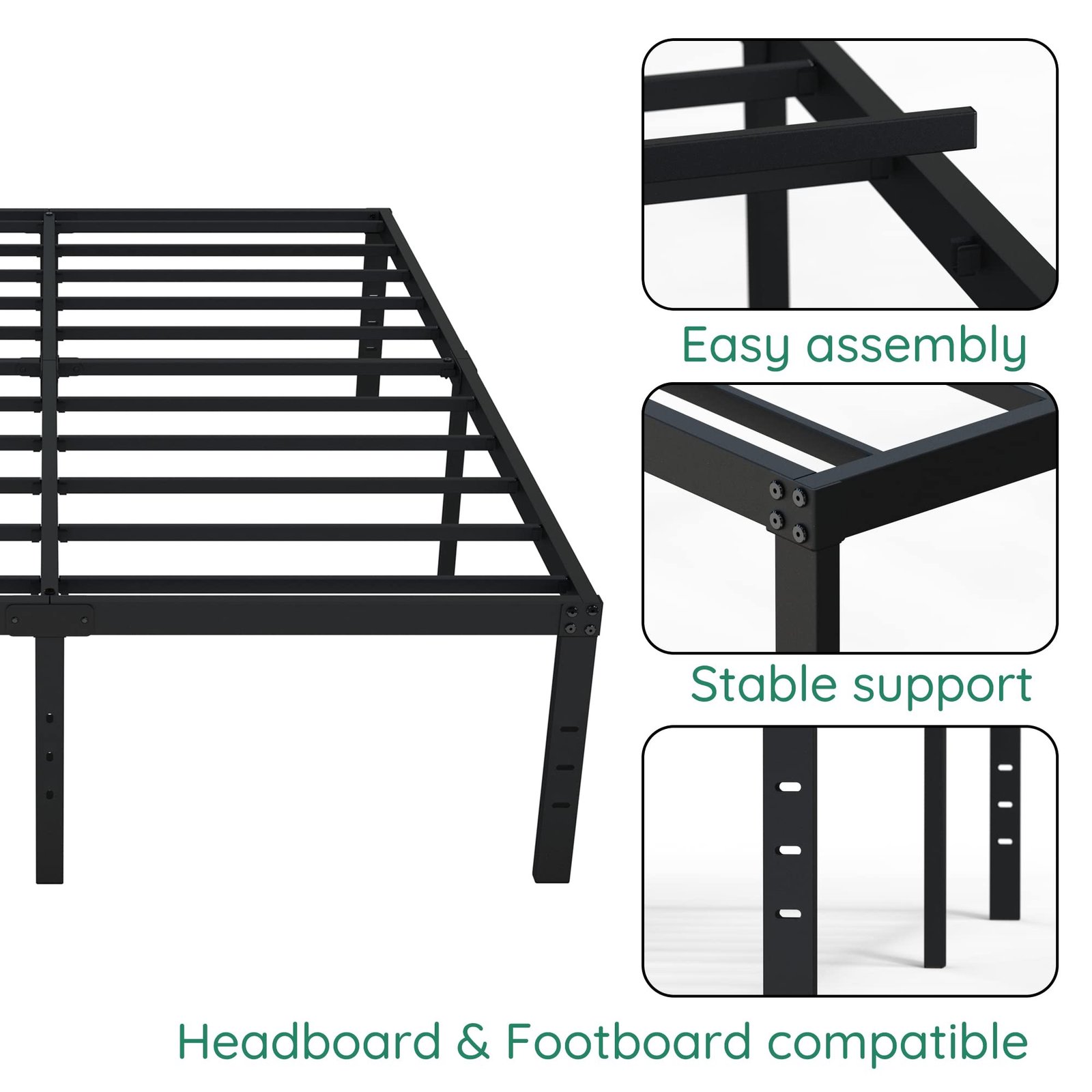 Minimalist Design and Headboard Compatible: The minimalist design goes well with other bedroom furniture and fits perfectly in any bedroom. Black powder-coated metal adds an exquisite look to this extra tall bed frame full size. 3 Holes in the legs of the bed allow for the installation of the headboard and footboard.
