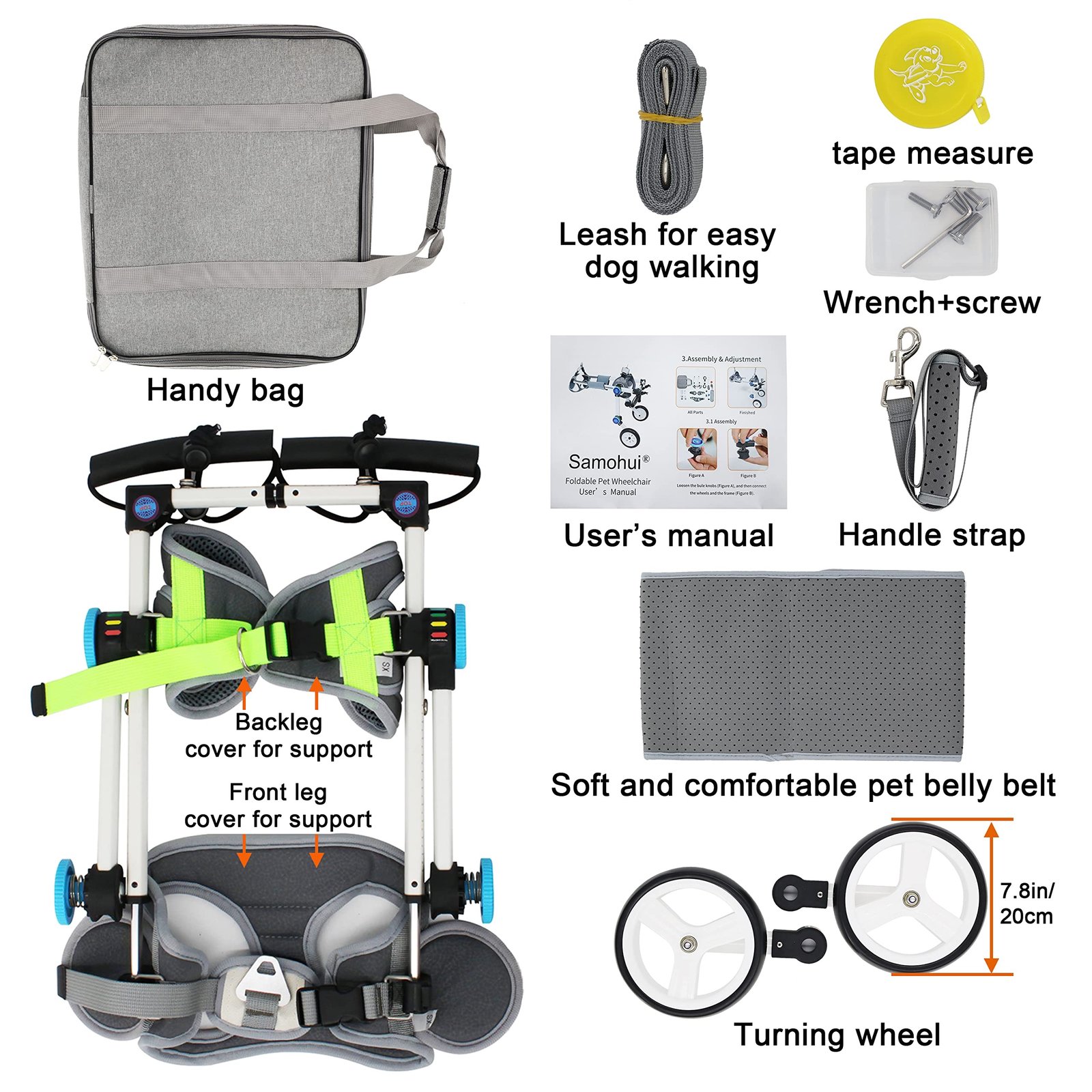 [Note]: Two-wheel FOLDING WHEELCHAIRS are only suitable for pets with disabled hind legs but normal front legs. If your dog is seriously injured, we recommend that you go to the veterinary hospital for help as soon as possible. Wish your DOG HEALTHY.
