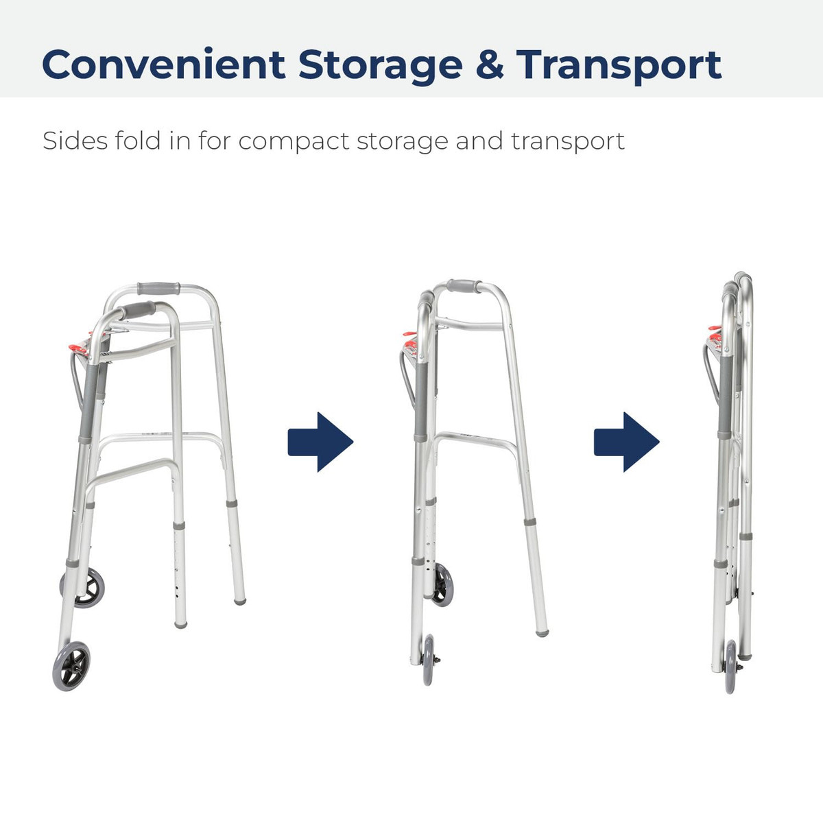 Wheeled Walker: Designed for safety and convenience, this rolling walker features push-button mechanisms that may be operated by fingers, palms, or even the side of the hand