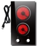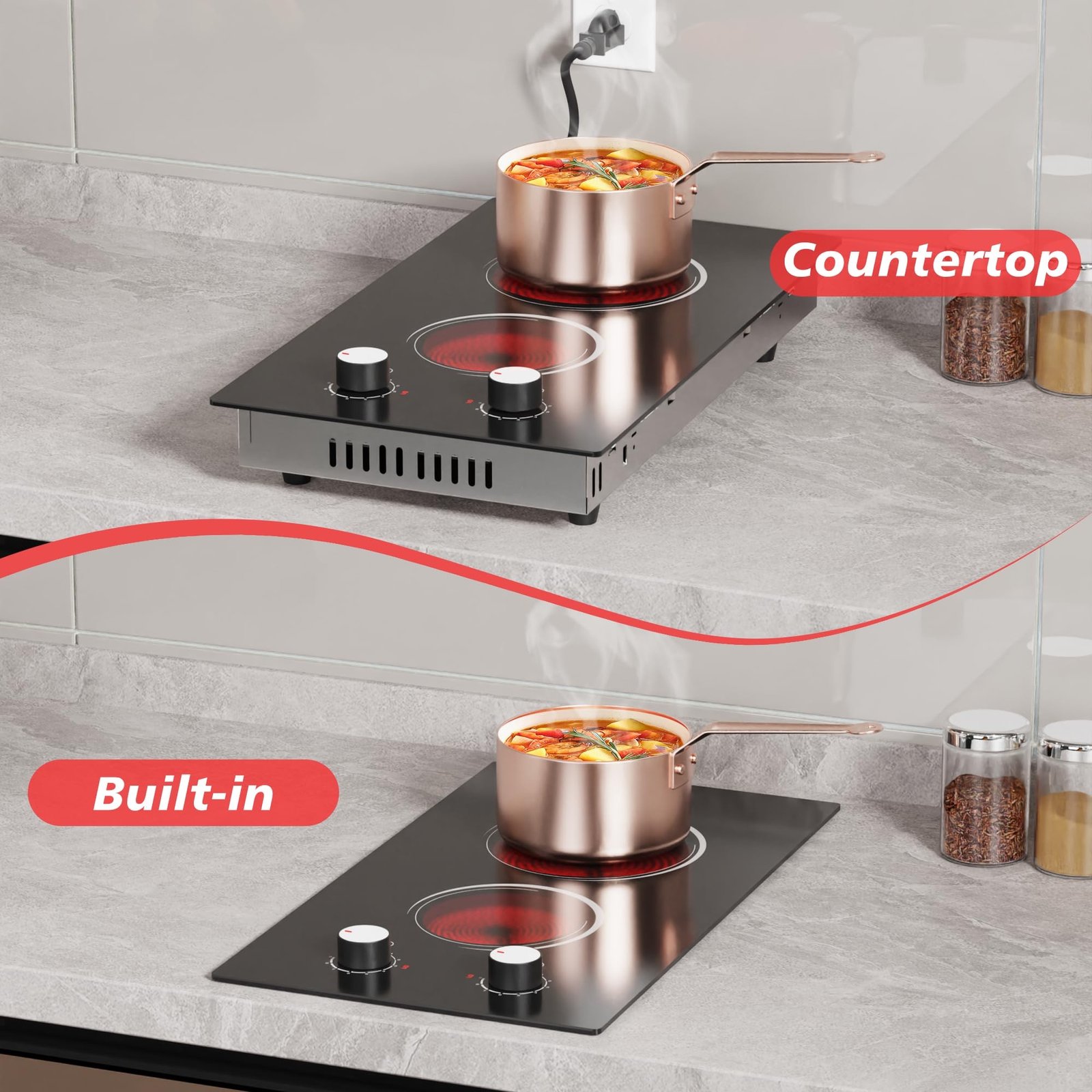 【2 Burner Electric Cooktop 110V】This 12 inch 2 burner electric cooktop is designed to plug into a 110V outlet, which meets US safety standards. Plug and work, saving the trouble of finding an electrician to connect the wires. The total power of the double burners is 2000w. The 1400w burner heats up quickly and suitable for cooking.The other 600w burner is good for keeping warm, it is a good choice for reheating milk.