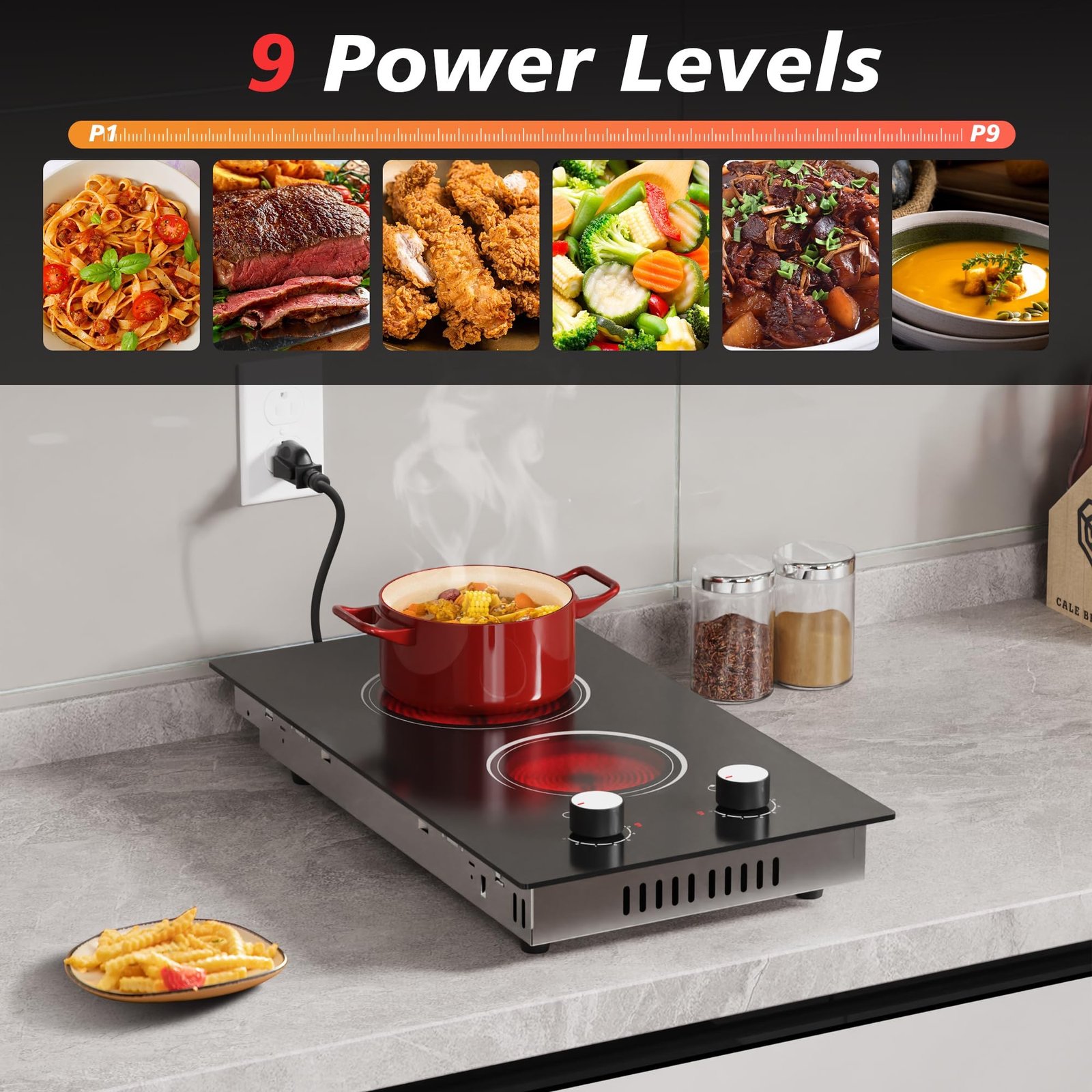 【9 Heating Level】Even though the 12 inch electric stove only has 2 burners, it also has fine power level divisions. The electric stove top has 9 heating level to adjust, from p1 to p9.Different levels are suitable for cooking different foods.Whether frying or sauteing, meet your diverse cooking needs.