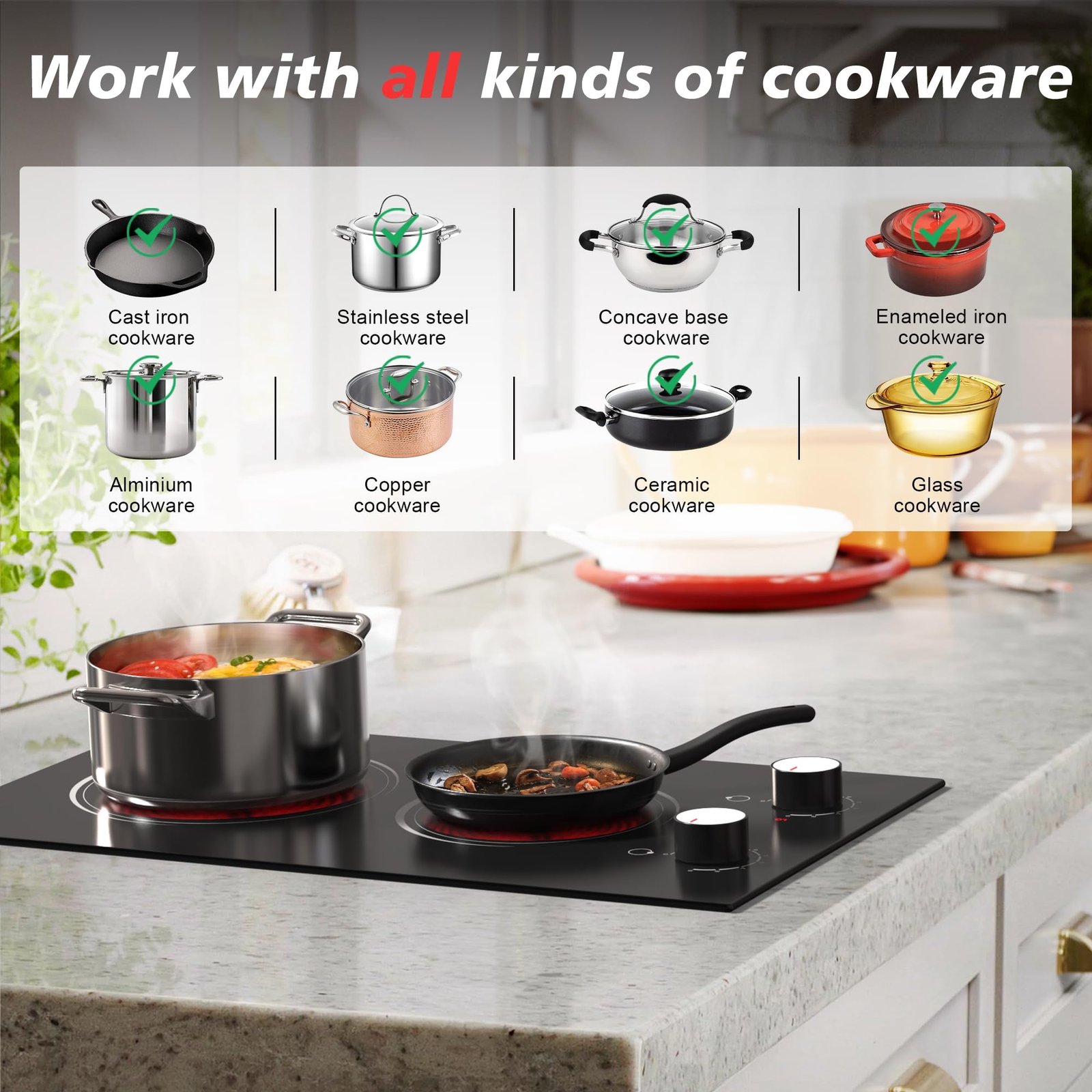 【Suitable of All Kind of Cookware】Double burner electric cooktop has a black glass surface and is compatible with a variety of cookware, including iron, cast iron, enameled iron, stainless steel, glass, ceramic, copper, and aluminum. This black glass cooktop is durable and easy to clean, and most stains can be cleaned with a rag. The included scraper helps you remove stubborn stains.