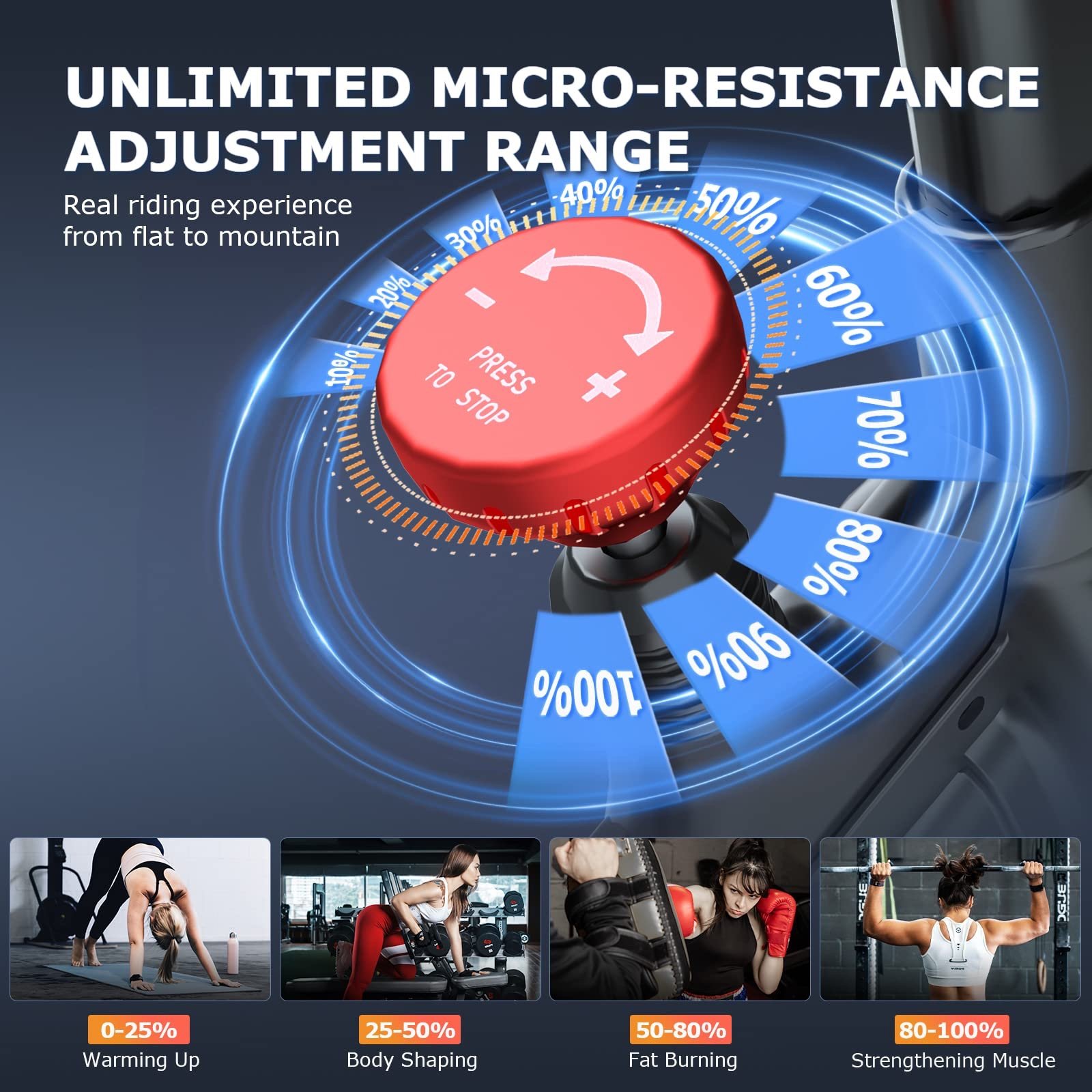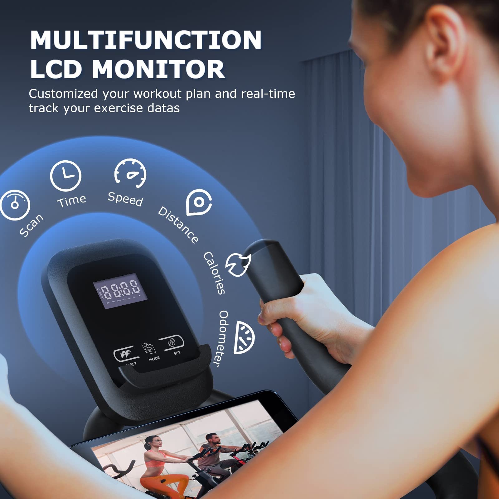 [Customized Your Workout Plan] The monitor on our indoor cycling bike can capture your time, spd, dst, cal, odometer, and keep track of your exercise progress in real time. A dial tension knob to navigate the unlimited resistance levels makes you experience riding from the flat to the mountains. With a tablet holder you can watch spin class on your Tablet while riding to simulate traveling through France, gravel rides through the Utah backcountry, and even mountain bike rides in New Zealand.