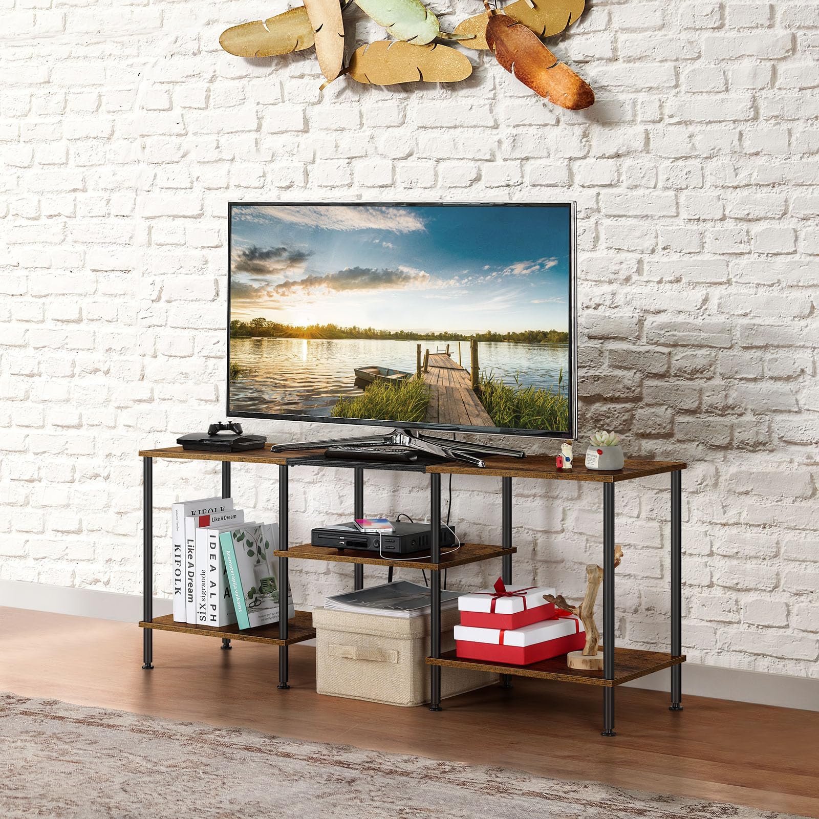 【Industrial Style TV Table Stand】Embrace the perfect blend of modern and rustic industrial styles with our media cabinet. The tabletop features a striking mix of colors, while the classic matte black iron frame adds a touch of sophistication. The farmhouse TV stand can also be used as a sofa table, coffee table, side table, or console table with storage, adding both functionality and style to any space.