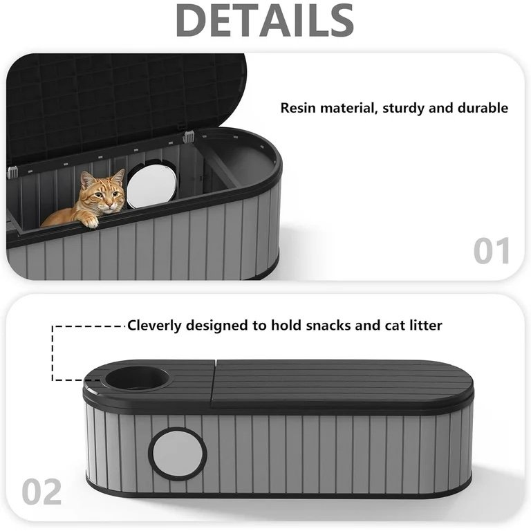 Hidden Furniture Design & Stylish Aesthetic: Doubles as functional litter box furniture, blending seamlessly into home decor to hide the litter area; sleek resin build in Black & Grey complements indoor/outdoor settings, balancing style and practicality.