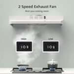 EASY OPERATION VENT HOOD:Rocker button control, simple operate. Easy to turn on and off, Low/ High Speed button suitable for different cooking method. 2W LED offer enough brightness to meet your cooking need. Quiet operation keeps noise level less than 57dB at high speed