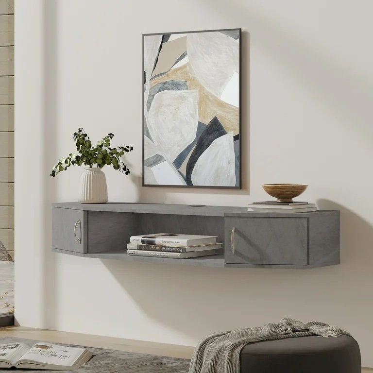 MUTIL STORAGE & HIDDEN CABINET】: The storage space with wall-mounted TV shelves is perfect for holding TV components, game accessories, books and decorations. The hidden doors of the floating entertainment center on both sides can cleverly protect privacy, while the center door can place game consoles, stereo speakers, DVD players and CDs to make reasonable use of the space.