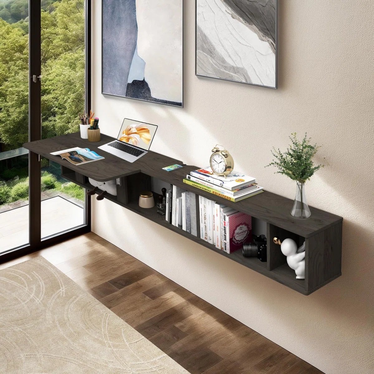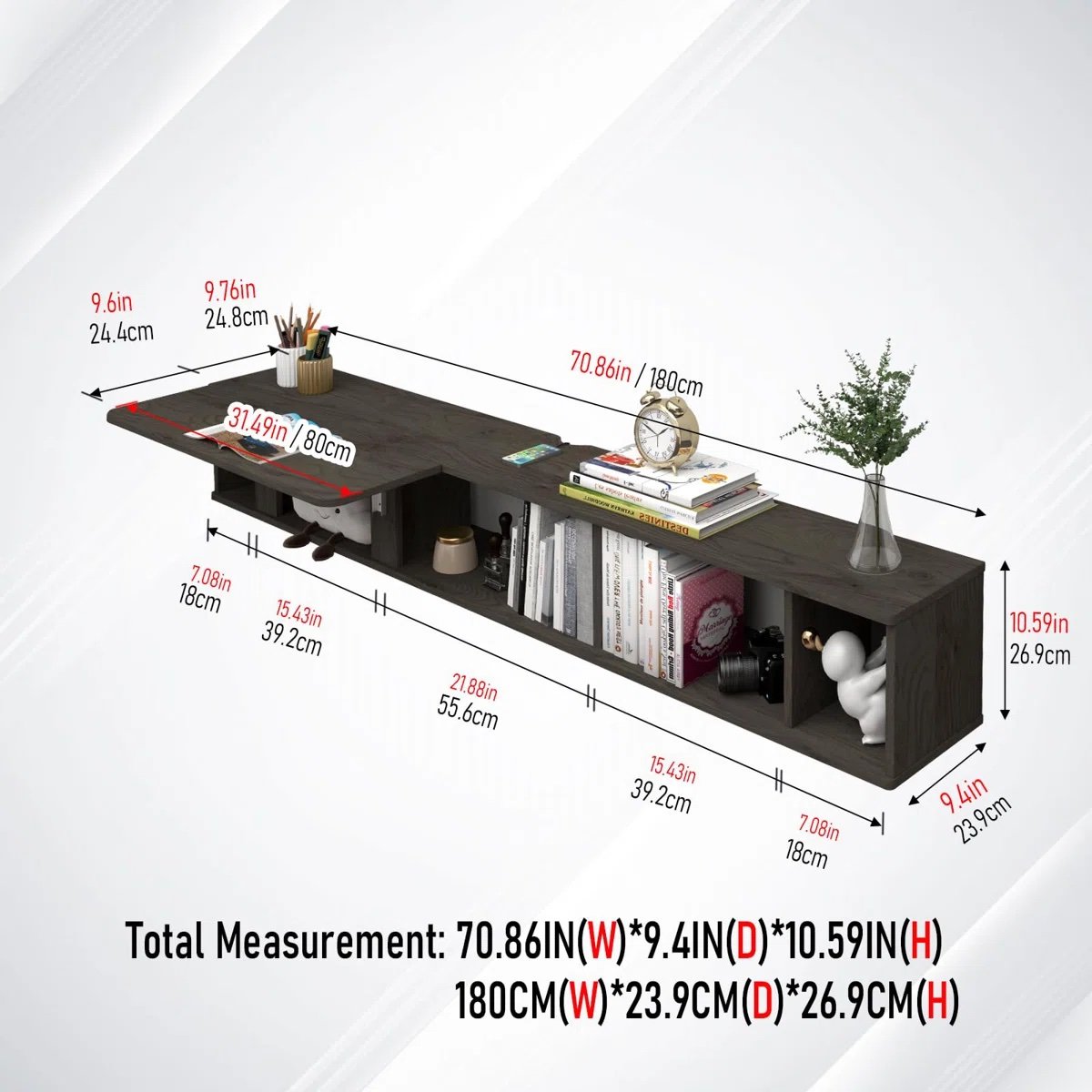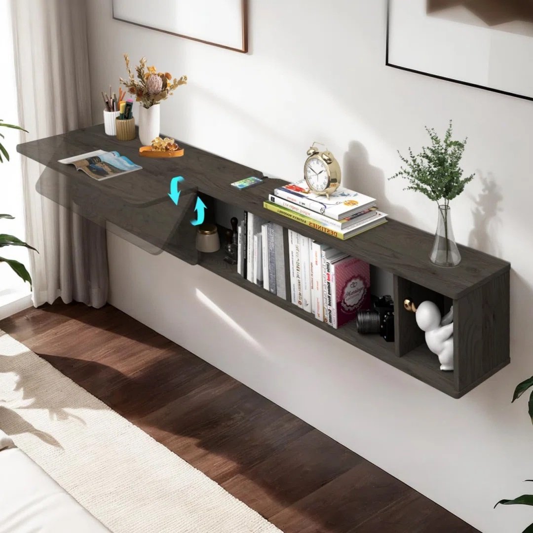3 in 1 Design: The floating desk can be used as floating wall shelf, floating tv shelf and writing study bedroom desk. The large wall mounted desk can be fold down when not use that can save much space.Durable Plywood Materials: Made from solid plywood and well made hardware, our folding wall desk is durable,sturdy and easy to clean.Large Storage & Space Saving: With wall mount floating design, it free up much floor space. Designed with a folding floating desk which is functional for writing, study or work. Stay organized with three open cabinets beneath the desk. Keep your essentials within arm’s reach, whether it’s books, office supplies, or personal items.Easy to Assemble & Clean: The floating wall desk is easy to put together. Made from plywood and waterproof smooth finish, the wall mount computer desk is easy to clean and keep dust free.Versatile Usage: The folding floating desk is perfect for home offices, bedrooms, or any area where space is a premium. The floating design creates a modern and uncluttered look, making it a stylish addition to any room.