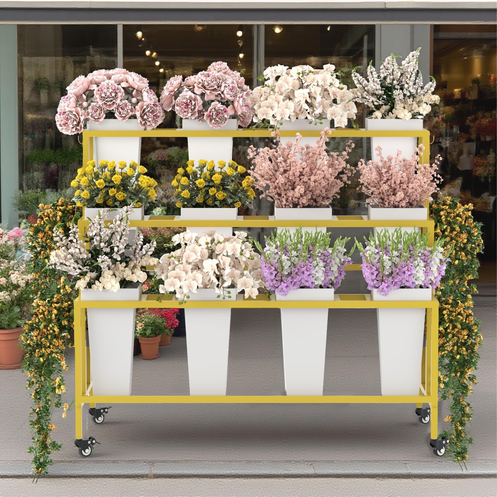 【Durable Metal Frame with Elegant White Finish】: Crafted from heavy-duty white-coated steel, this flower cart display stand offers reliable strength with a clean, modern aesthetic that complements indoor or outdoor décor.