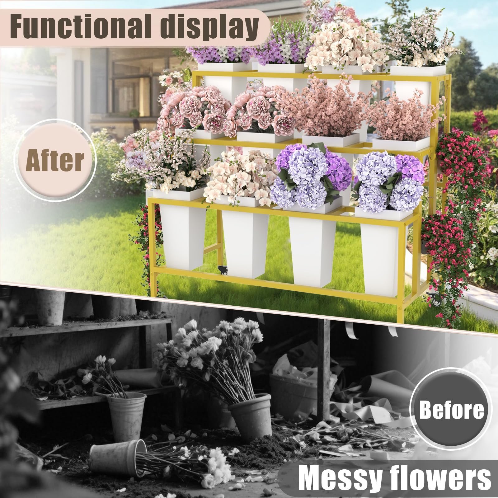 【Perfect for Events, Shops & Home Décor】: Whether you need a flower display stand with buckets for weddings, retail stores, garden patios, or home entries, this flower cart with wheels adds charm and organization to any space.