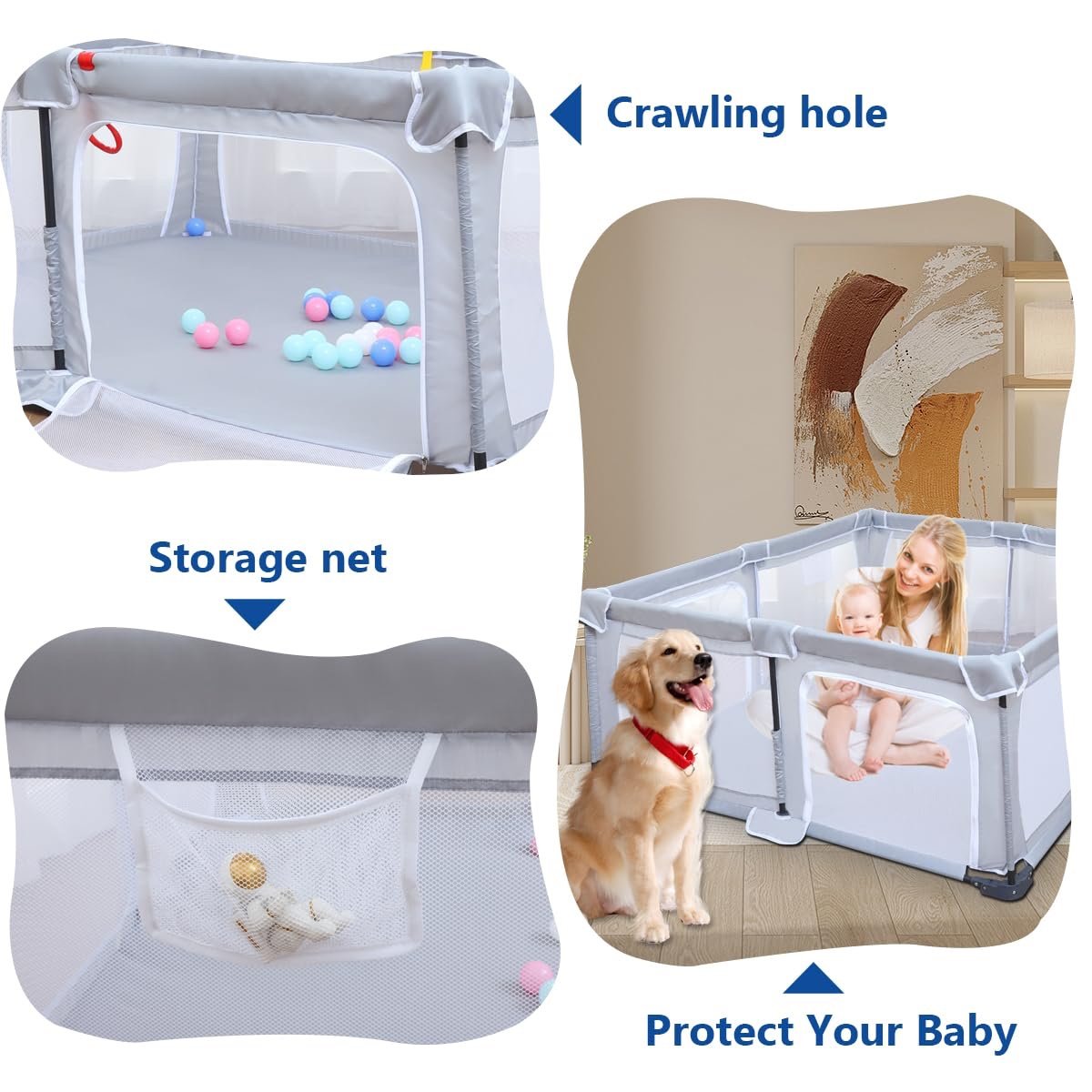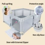 Transparent baby play area: surrounded by ventilated mesh cloth, 360° viewing Angle, wide view. The mother can interact with the baby, give the baby enough security, perfect parent-child interaction. Our products have a zipper door that can be opened on the outside, so that the baby can easily climb out and interact with the parents