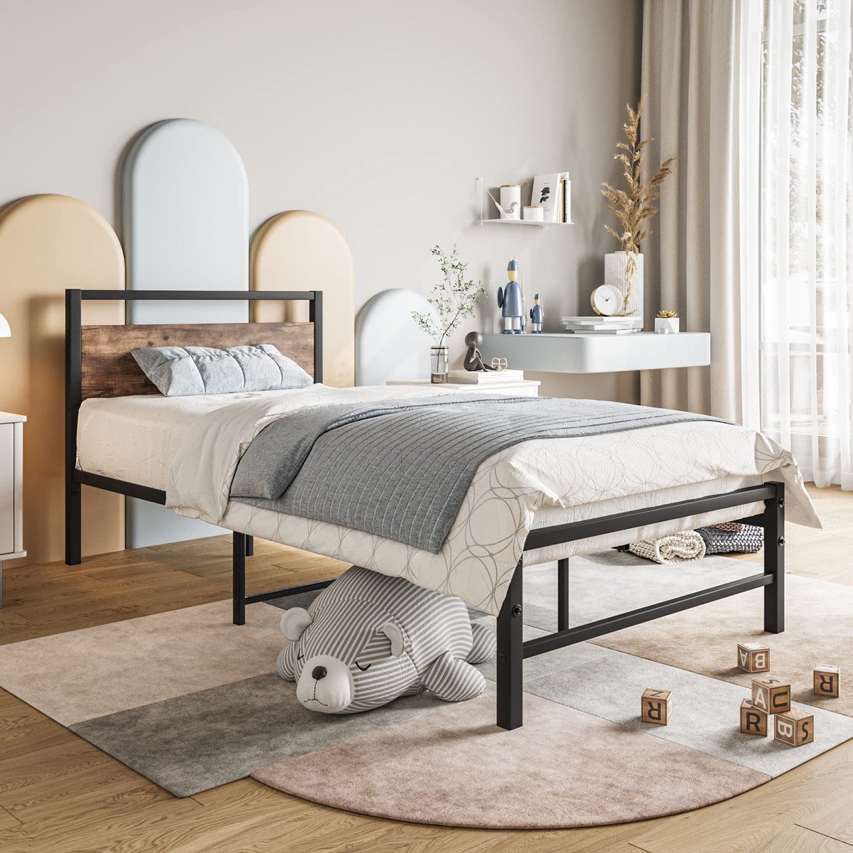 FOUBAM Twin Bed Frame w/ Wooden Headboard & Metal Platfor