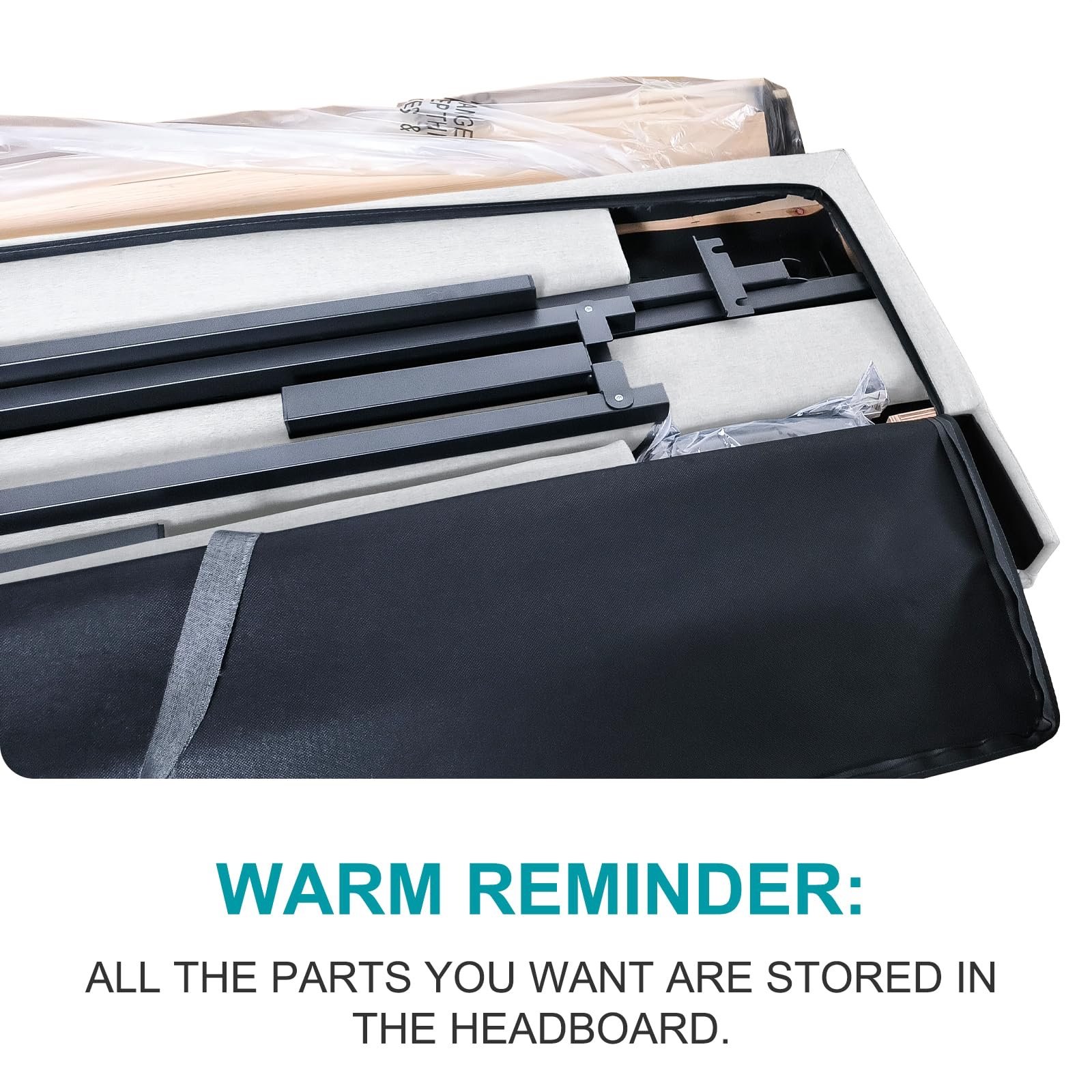Warm Tips Note:All parts of the bed such as feet,wooden slats, bed supports,screws,etc are included in the headboard and can be taken out by pulling the zipper
