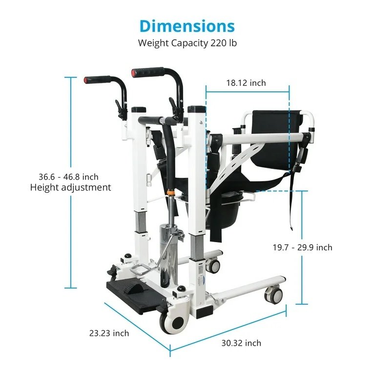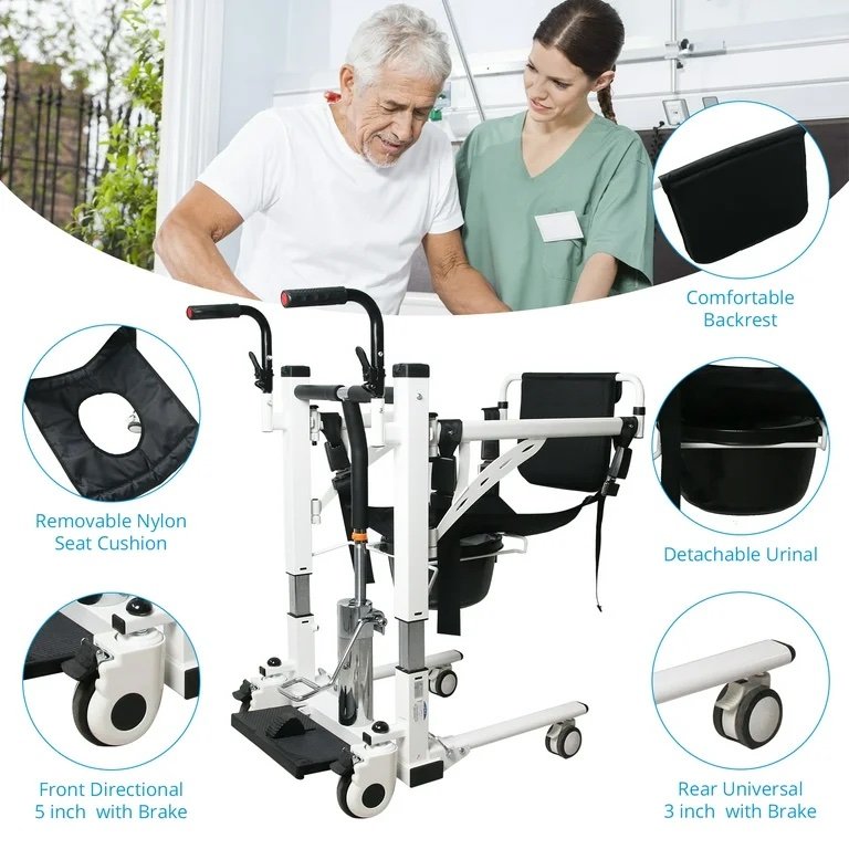 【Versatile 4-in-1 Chair】Experience the convenience of our upgraded patient transfer lift wheelchair, a versatile chair designed for multiple functions. This chair can be used as a bathroom chair, bedside commode, patient lift, and transport wheelchair. It is suitable for various settings, including homes, nursing homes, hospitals, and other special care facilities. Additionally, it can be used in delivery locations such as railway stations, airports, and public transportation hubs.