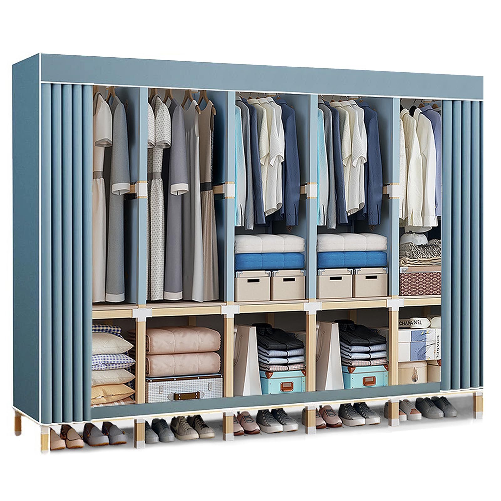 Robust architecture: The closet organizer wardrobe is made of durable non-woven fabrics and high quality zippers. The cabinet door top is made of sturdy square wood tubes and reinforced PP plastic joints. Thicker than most closets of tubing on the market, it therefore offers superior load capacity, ensures stronger, more stable, less bending, durable and can be used for many years.