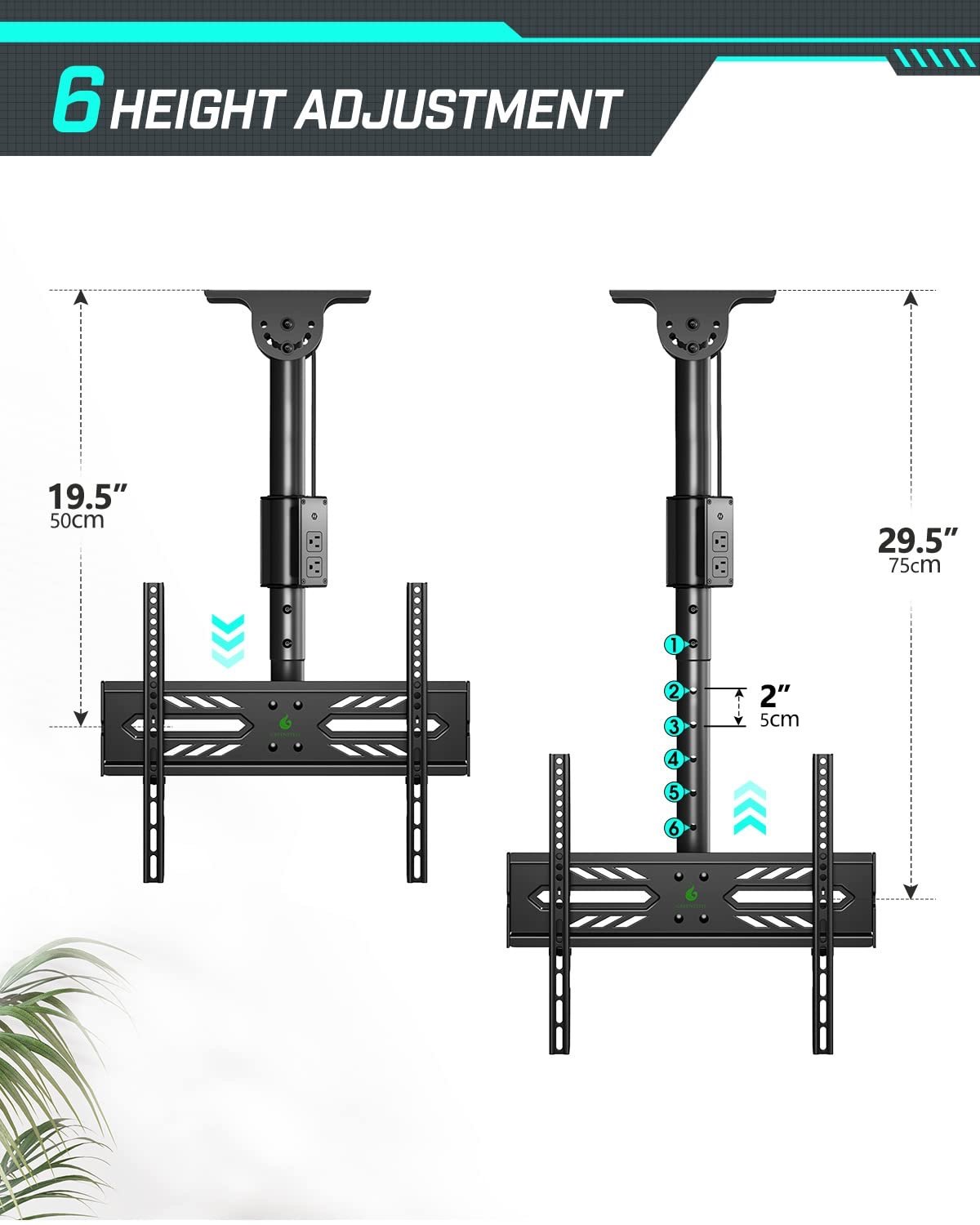 User Friendly Design with Power Outlet & Cable Management: Greenstell ceiling tv mount comes with 2 AC outlets with 900J Surge Protection and 13.1ft long power cord. As well as a built-in cable management system to conceal wires inside the mount pole for easy organization. No more messy cables or tangled wires