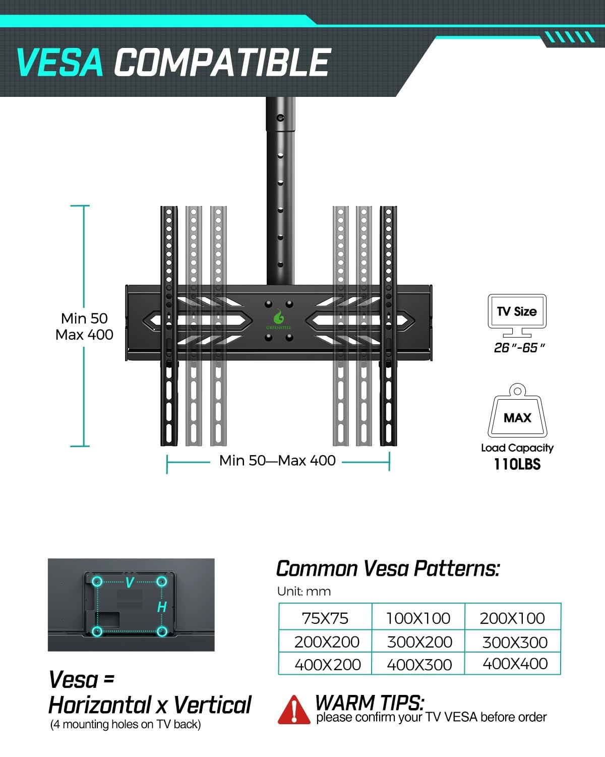 Universal Design: Greenstell tv ceiling mount fit 26-65 inch LCD, LED, or Plasma flat/curved screens with VESA pattern from 75X75mm (3”x3”)100X100mm (4”x4”) 200X100mm (8″x4″) 200X200mm(8″x8″) 300X200mm (12″x8″) 300X300mm (12″x12″) 400X200mm (16″x8″) 400X300mm (16″x12″) 400X400mm (16″x16″), it is compatible with TV brands such as Samsung, Sony, Sharp, TCL, LG, Vizio, etc. Holds up to 110LBS/50KG