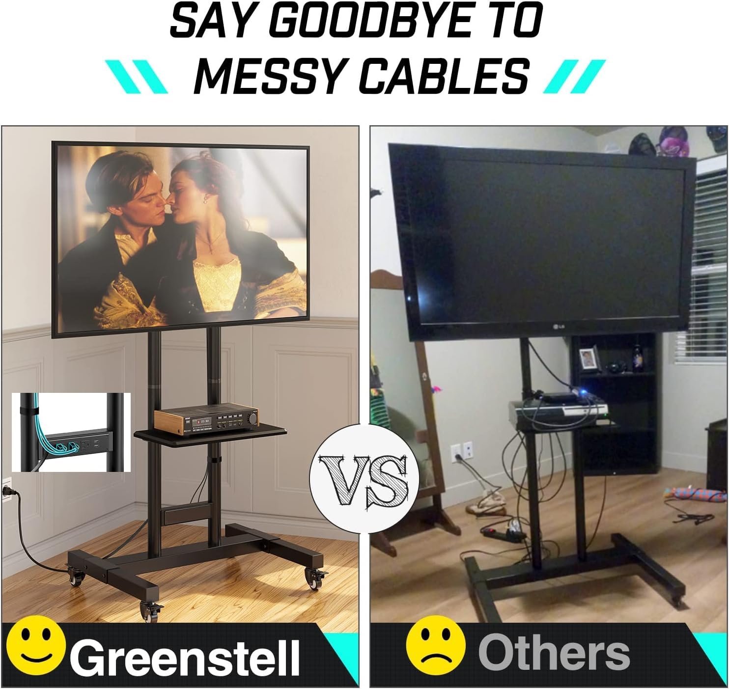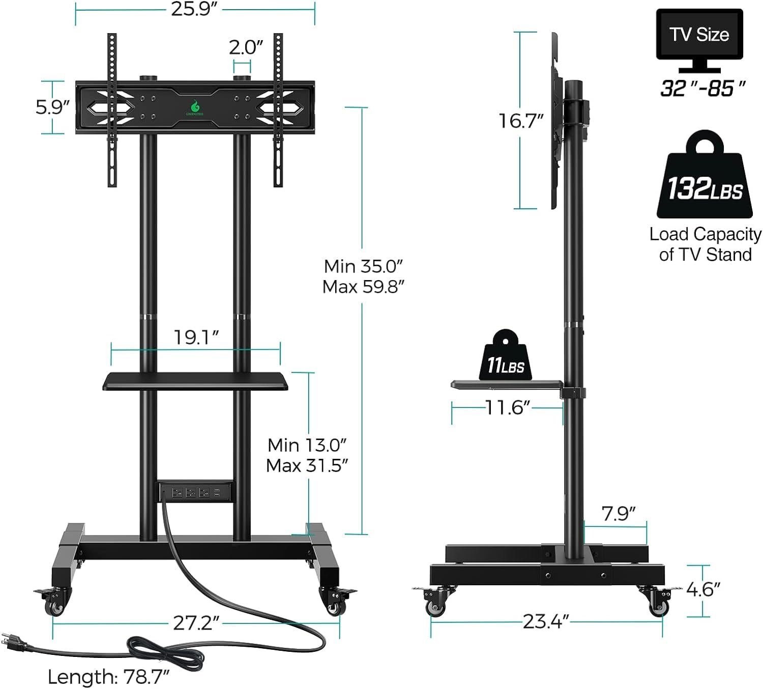 Power Outlet & Cable Management: Greenstell portable tv stand is equipped with 3 AC outlet, 2 USB ports and 6.5ft long power supply cord. Plus four cable managements to keep wires organized and neat. No more messy cables or tangled wires