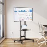 Movable Tall TV Stand: The base features 4 wheels providing smooth mobility on both hardwood and carpet floors. All wheels are easily locked to ensure safety. And the wheels made of high-quality PU materials will not make loud noises