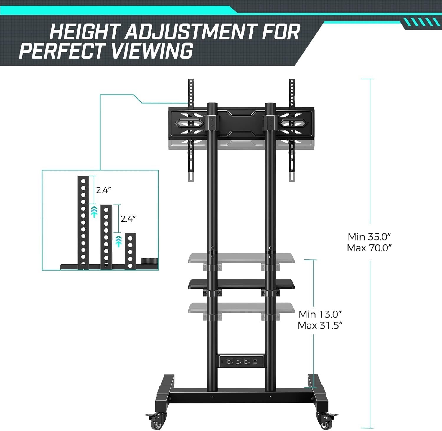 Height Adjustable Rolling TV Cart: Greenstell outdoor tv stand adjustable height from 35″-70″, and the sturdy media shelf can also be adjusted from 13″-31.5″, to provide the most comfortable viewing angle
