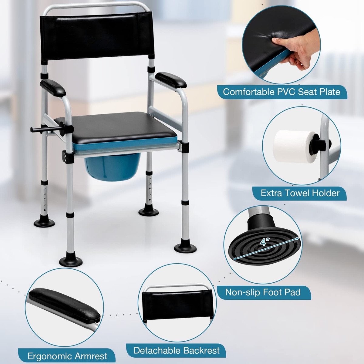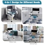 4 in 1 Multifunctional Commode Chair?GYMAX commode chair is a great assistant for the elderly and the disabled, as it?s not only a convenient bedside commode, but also a shower chair, a toilet safety frame, and a padded chair as well. Passed FDA test for reliable using experience.