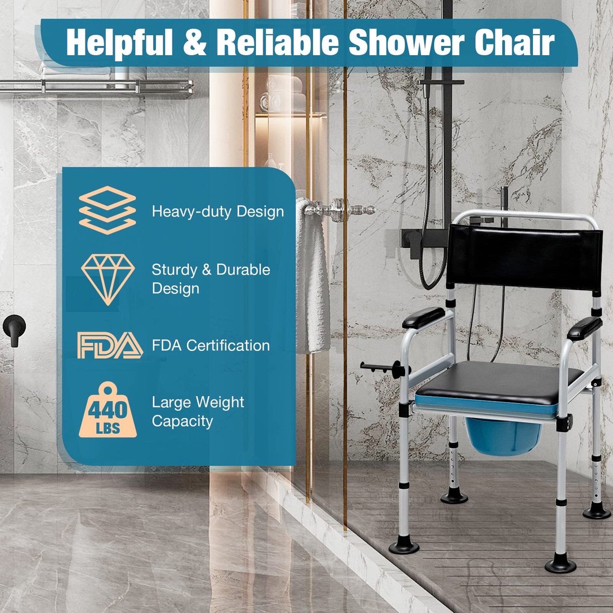 ?440lbs Heavy Duty & Waterproof?Made of high quality steel, this bedside commode is heavy duty with sturdy structure, holding up to 440lbs. Screw thread foot pads improves overall stability, and with water resistant surface, this shower chair is durable and reliable for damp and easy-to slip environment like bath room.