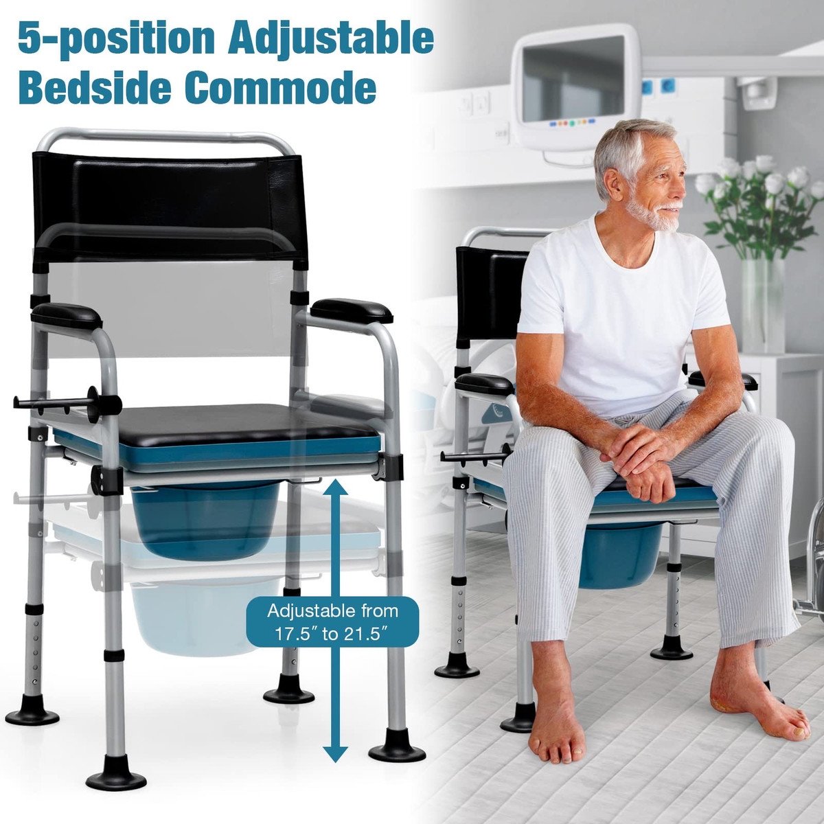 ?Height Adjustable & Removable Bucket?5 Level Adjustable Height makes this multifunctional commode suitable for most people to sit comfortably. Removable bucket can be take out from left side, right side or up side. Extra wide bucket with lid avoids spillage and makes operation easier.