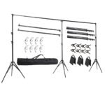 Our 10×20 ft adjustable backdrop stand comes with anti-slip spring clamps & clips, and sandbags.