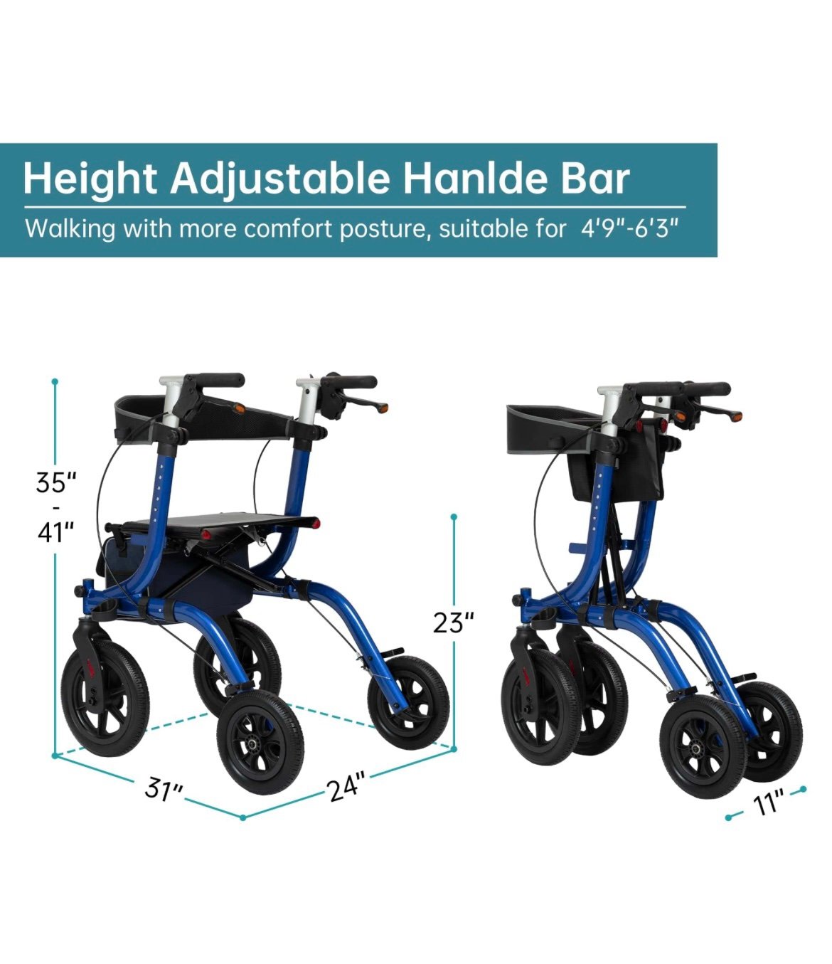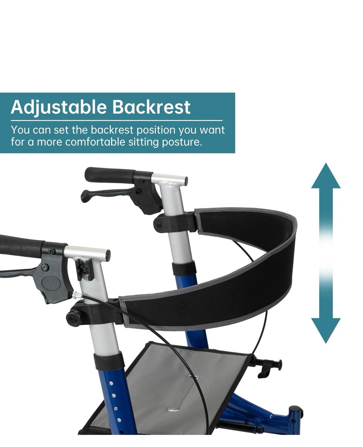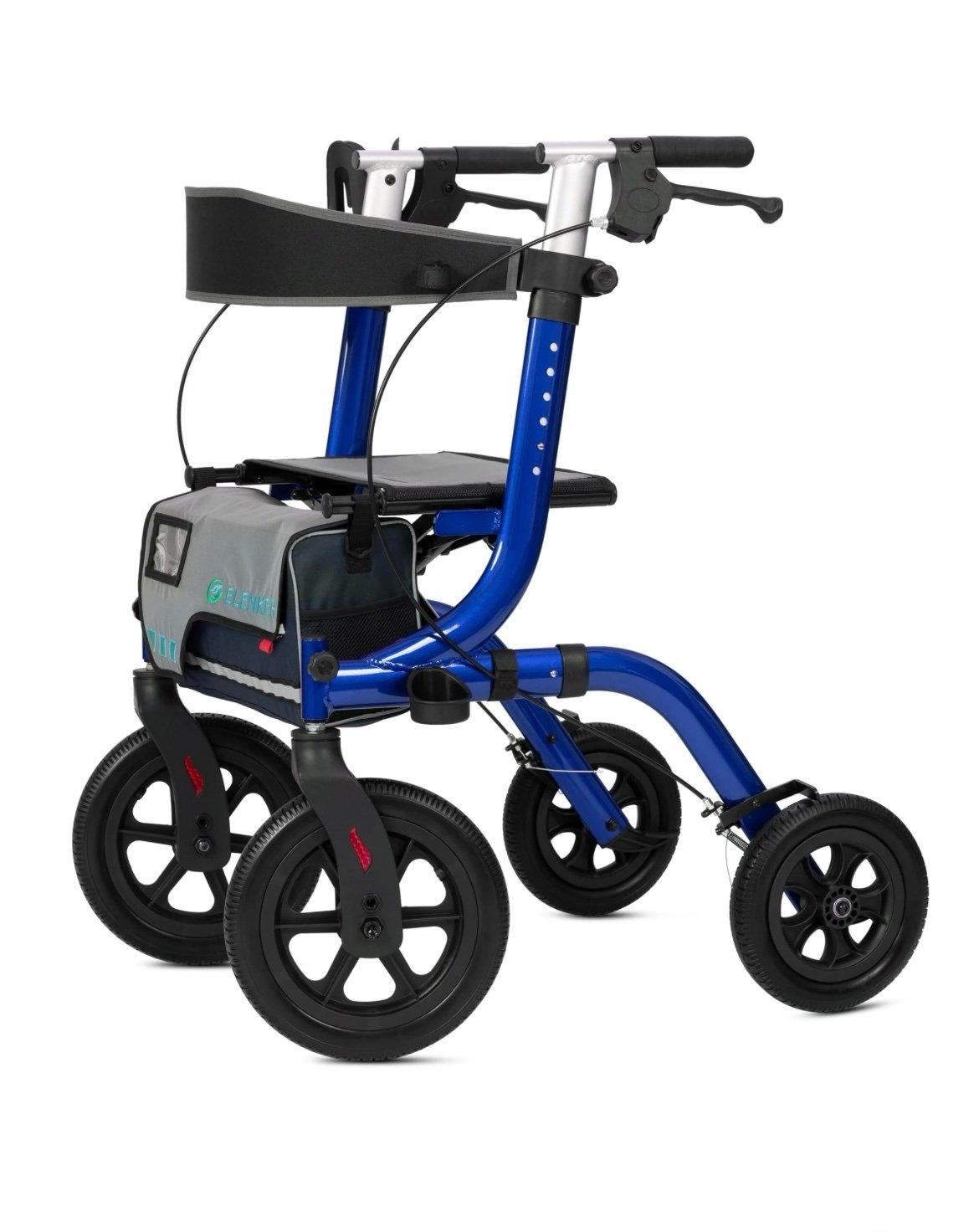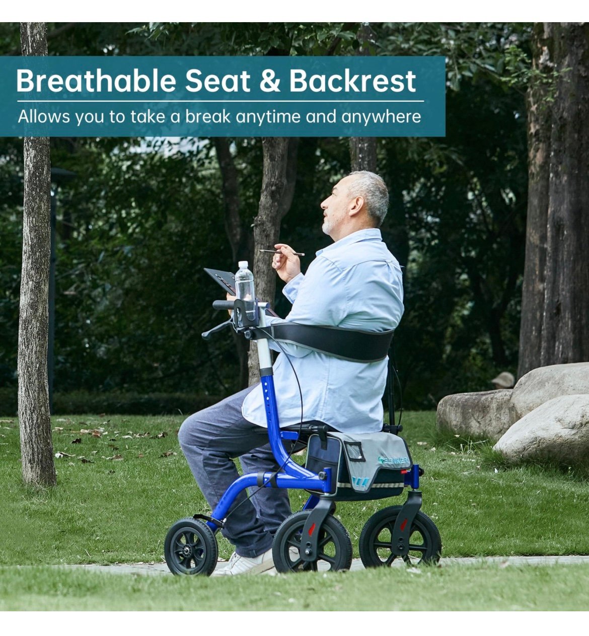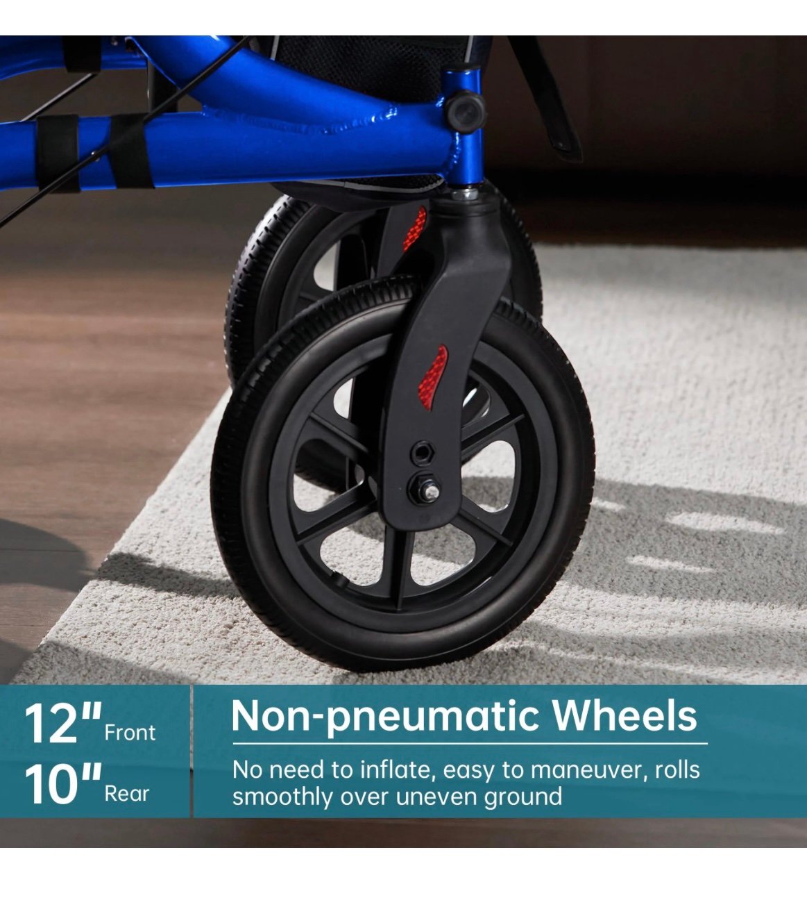 Perfect Outdoor Rollator Walkers: 12” solid polyurethane flat-free explosion-proof tires, non-slip, wear-resistant, with good shock absorption, easy to maneuver on grass, gravel, dirt and gaps in sidewalks.