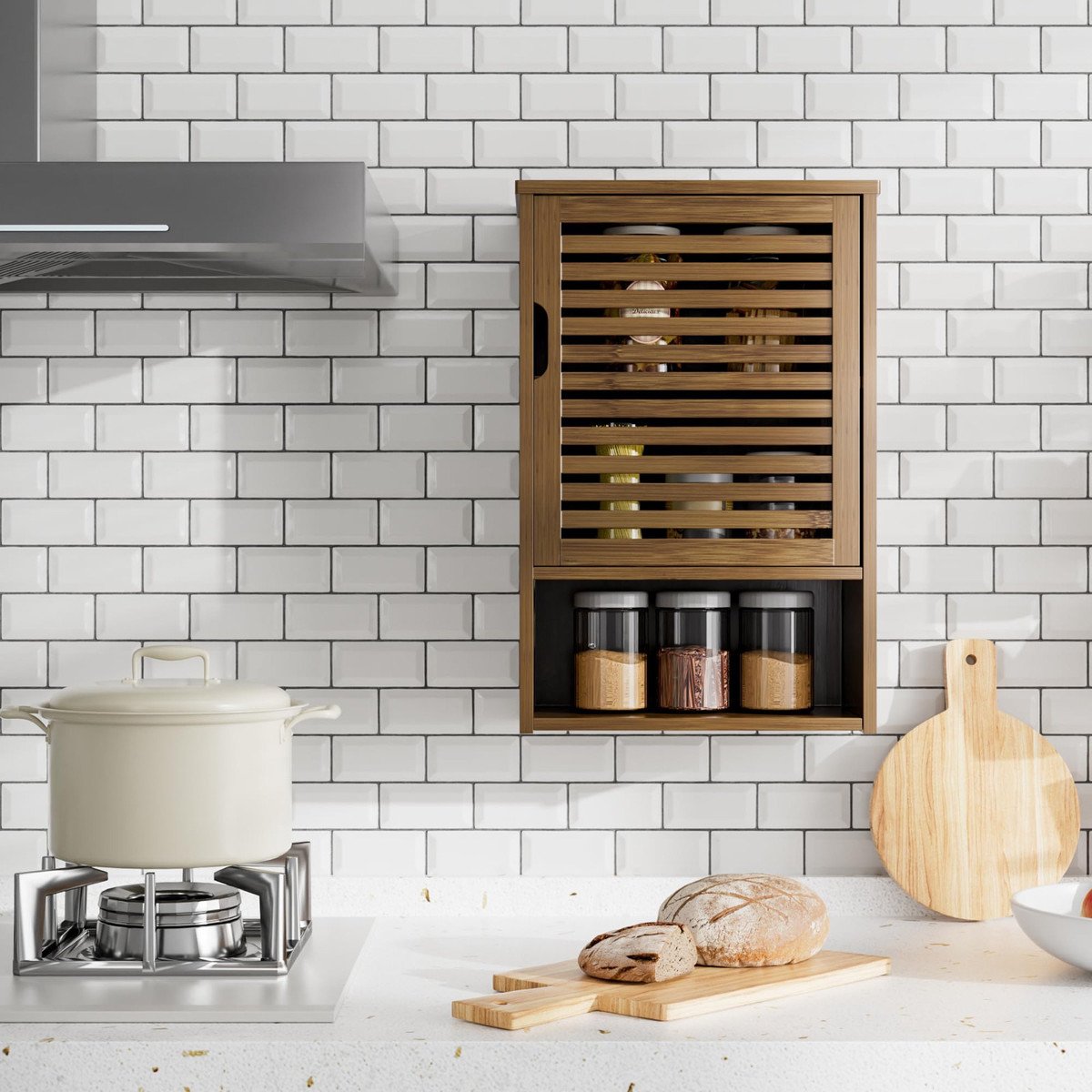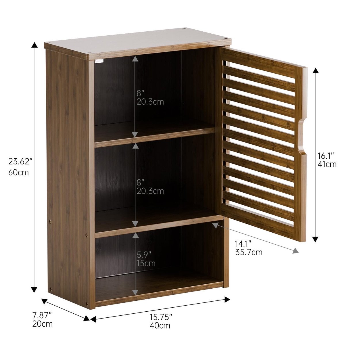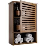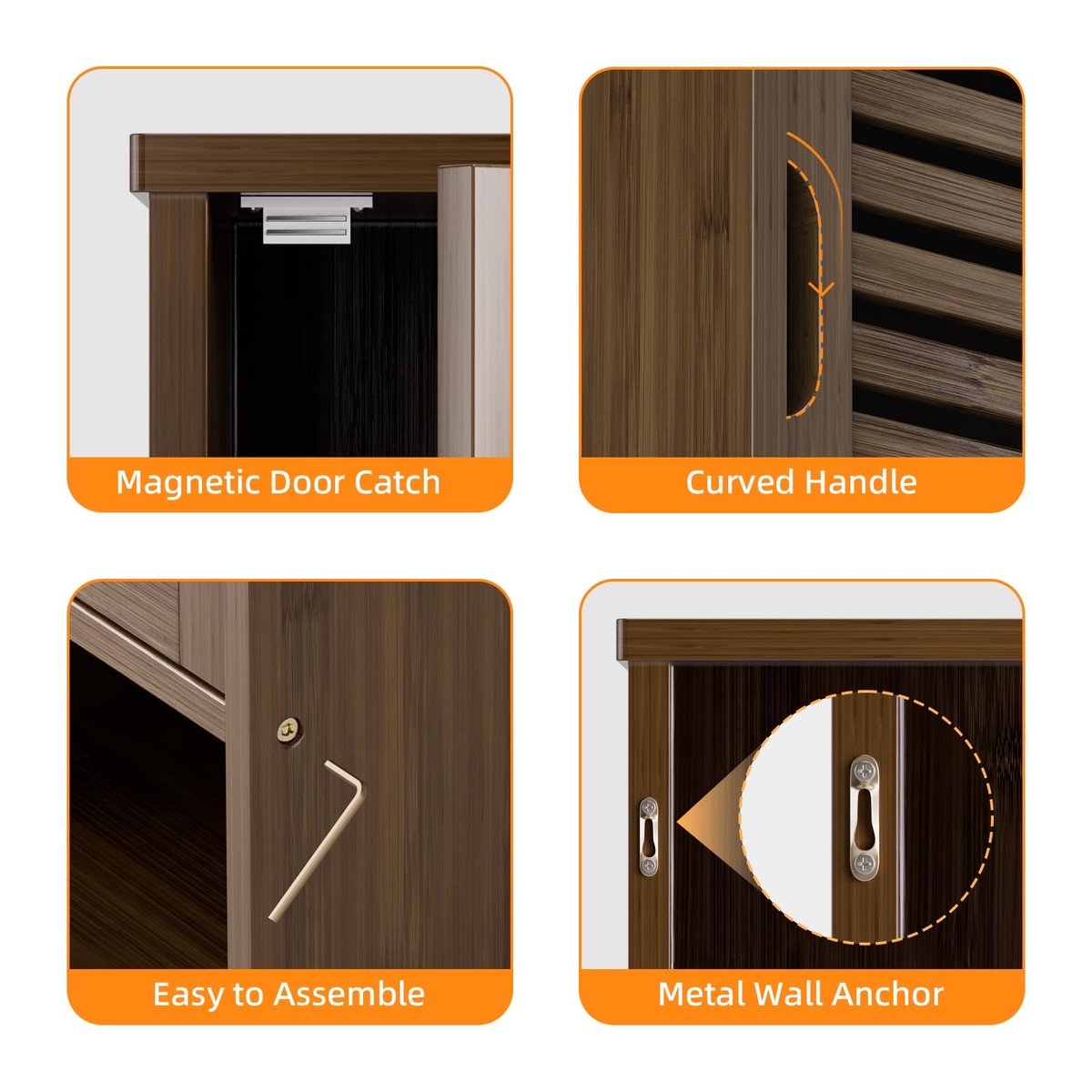 STURDY CONSTRUCTION – Made from natural bamboo, eco-friendly lacquer coating, moisture-proof and anti-scratches. The middle and bottom shelf can hold up to 33 lbs/15 kg each. There are 2 wall-mounting kits on the back for adding stability without worrying about it falling off the wall. The door is closed by a magnetic lock that prevents items from falling and effectively protects against dust