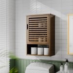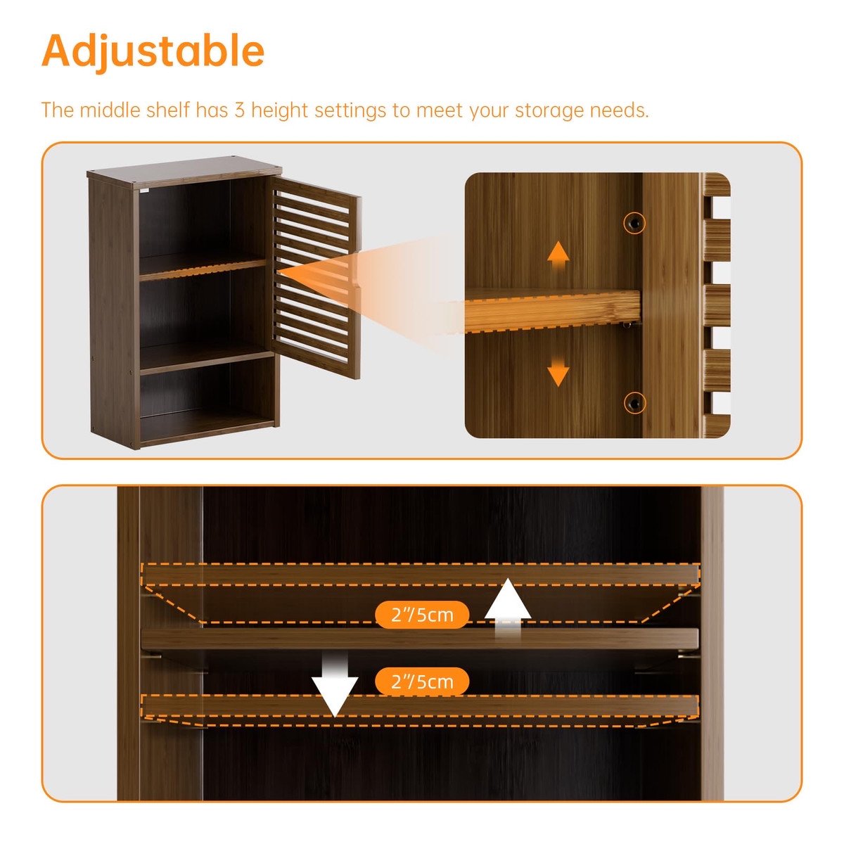 VERSATILE CABINET ORGANIZER – The wall-mounted bamboo cabinet is blend perfectly into any room’s decor. The adjustable shelf with door allows you to hold towels, toilet paper, shampoo, laundry detergent and other bath essentials, and the open bottom shelf can place small green plants or keys, or hang it on the kitchen wall to store tableware and spice jars, or a makeup vanity, medicine cabinet, bathroom cabinet over the toilet, hallway cabinet, etc.