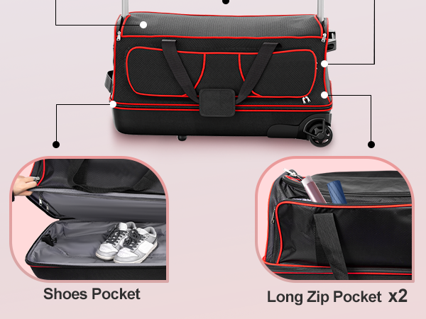 Extra Large Capacity Garment Duffle Bag: Travel costume bag has 103.6L storage space and multiple pockets, which is enough to meet most of your needs during your trip. Closet suitcasecan hold 4-5 days worth of daily essentials such as dresses, skirts, shoes, toiletries, makeup and umbrellas. There is also a dedicated postcard pocket to avoid losing, mixing up or being hard to find in the rush of minutes before going on stage