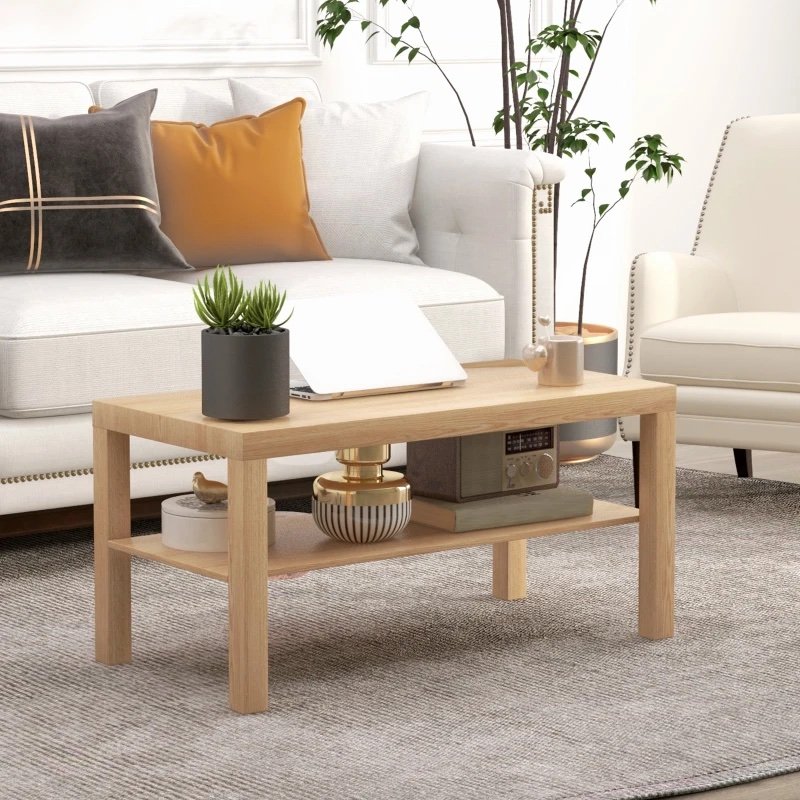 Open Shelving: Bottom shelf of this living room table provides ample storage or display space, leaving the table top open for décor, dining, work