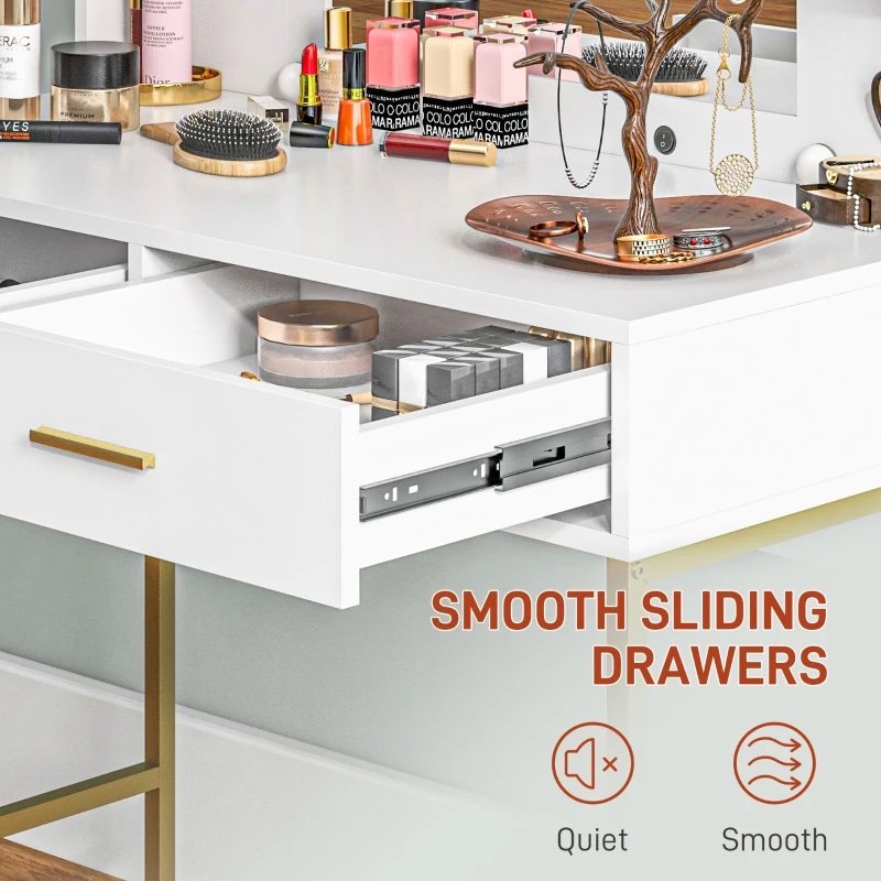 Spacious Storage: This makeup table offers a large tabletop, two smooth-sliding drawers, and six open compartments, providing ample space to organize your beauty essentials and accessories efficiently.