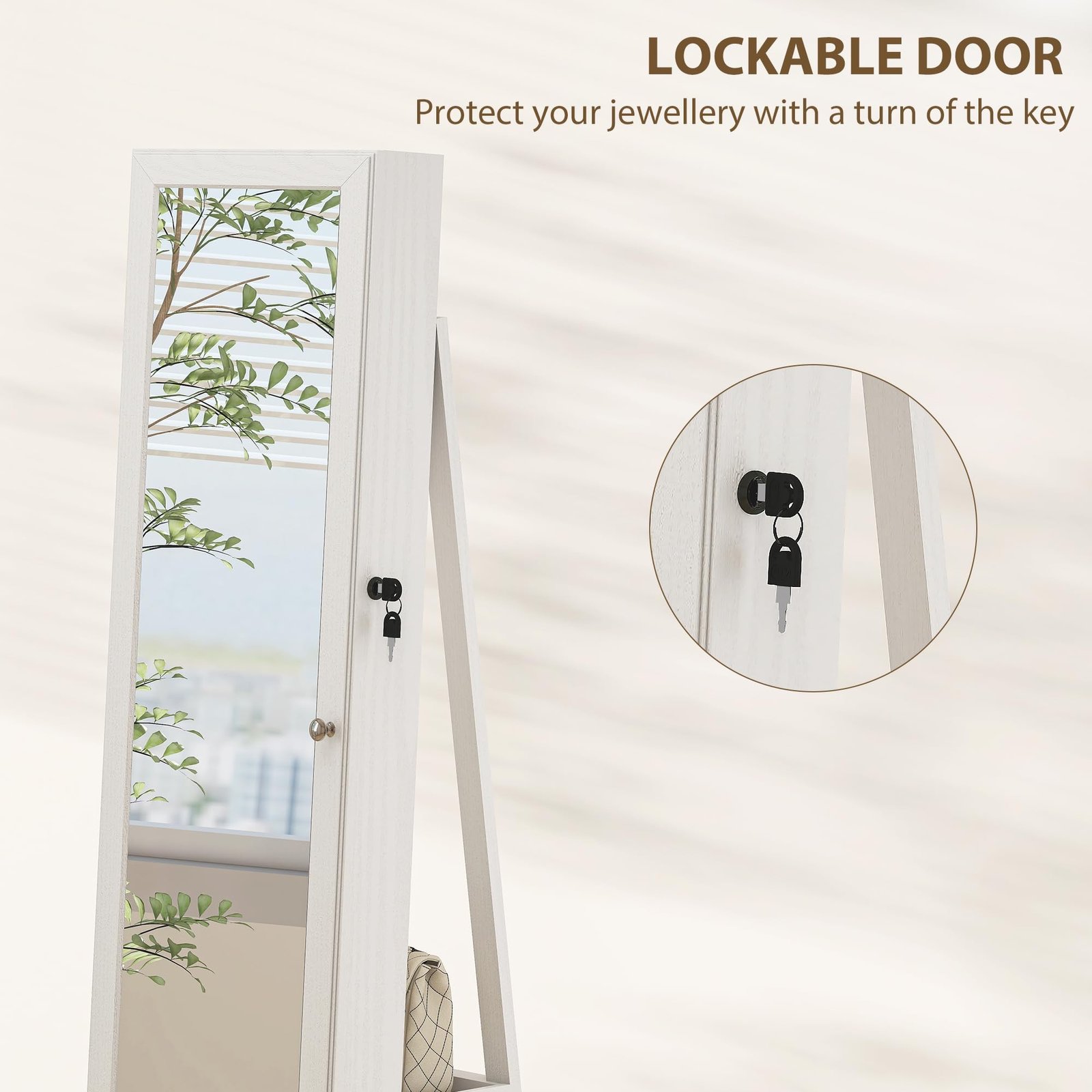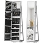 HD Full Length & Inside Mirror: This jewelry mirror has a lovely full-length mirrored door that is great for trying on clothes. Open the door and inside there is an extra mirror for your make-up and matching jewelry.