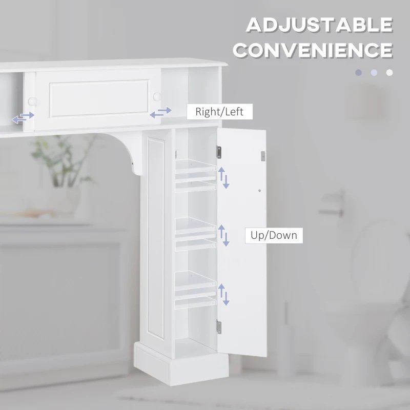 Ample Storage: The over toilet storage cabinet features 4 open storage cubbies with an adjustable shelf as well as a top cabinet with sliding doors and 2 compartments for storing towels, toilet paper, and grooming products. Flat top can also be used as a display centre for your bathroom.