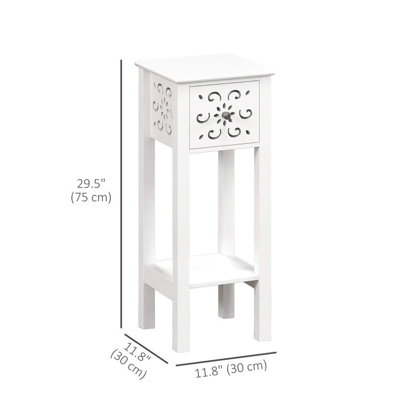 Living Room Table Dimension: 11.8″L x 11.8″W x 29.5″H (30 x 30 x 75 cm); Weight capacity: total 55 lbs (25 kg), top/shelf 22 lbs (10 kg), drawer 11 lbs (5 kg). Assembly required