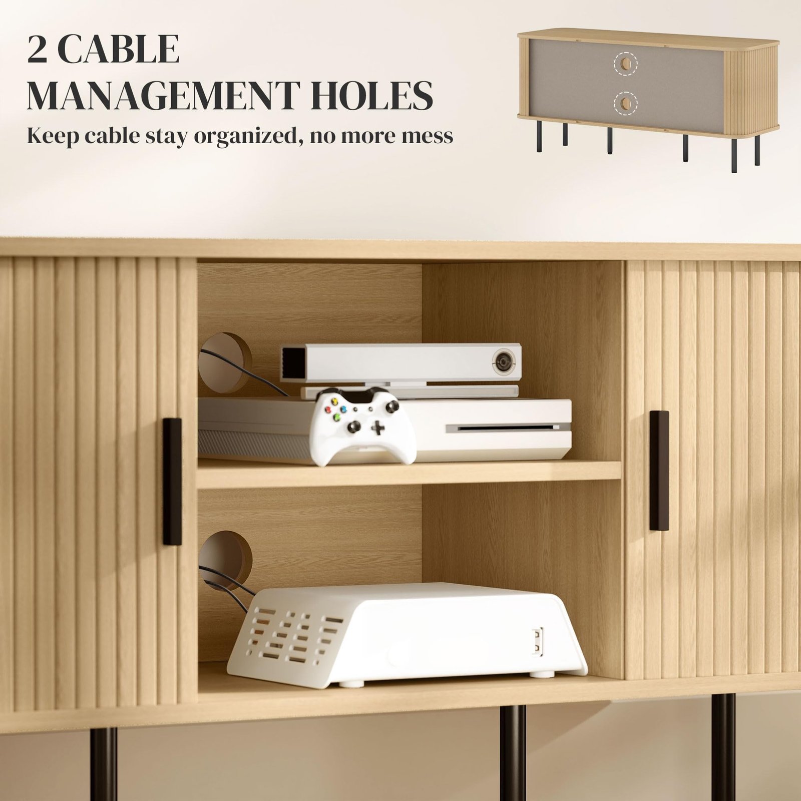 Cable Management: This TV unit features two cable holes, allowing you to efficiently run those eager-to-tangle cables into neat rows, making the living space look tidier and more organized.V