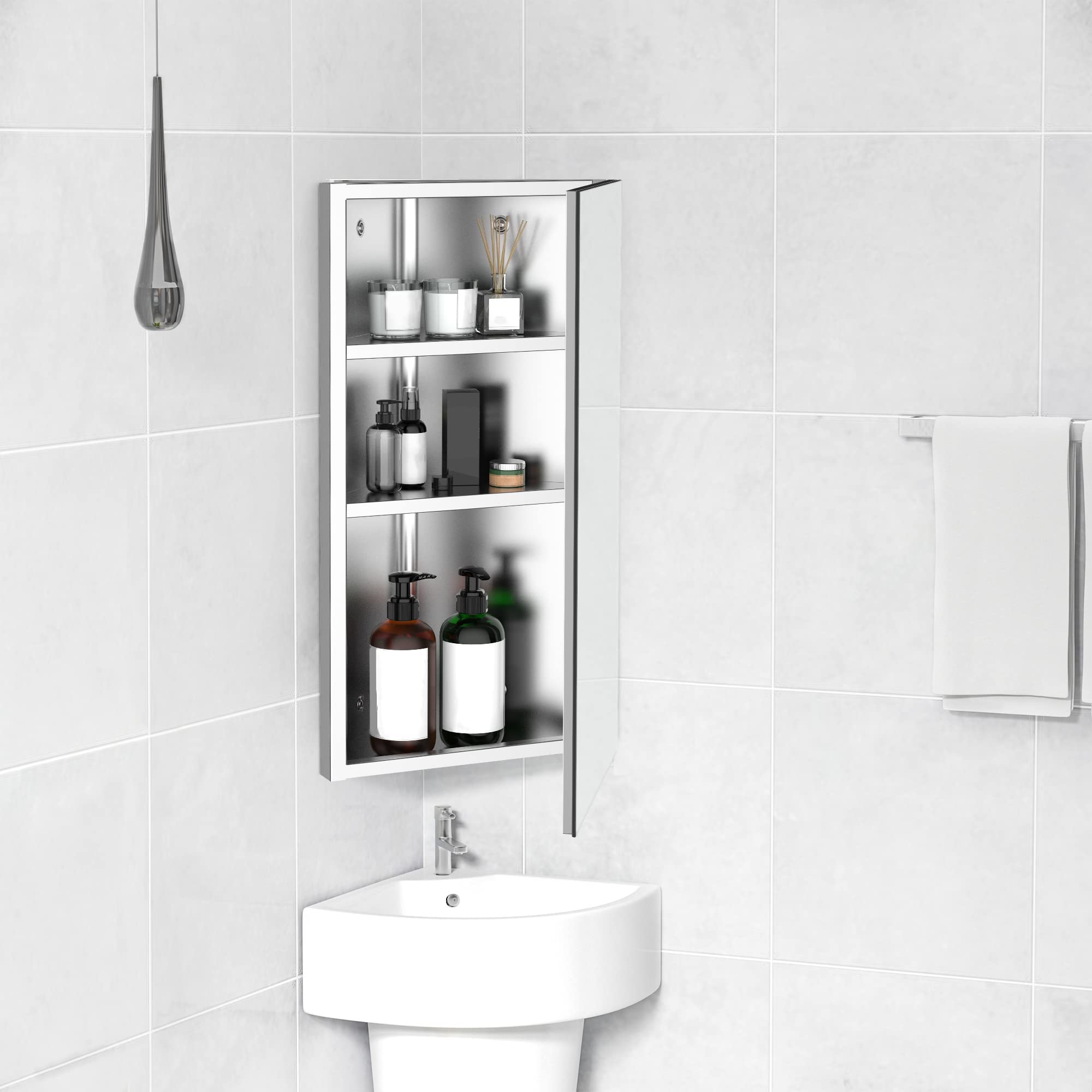 Stylish Medicine Cabinet: This stainless steel floating corner cabinet has a clean appearance, enabling you to store personal hygiene essentials in bathroom. And the outside mirror provides convenience for your dressing.