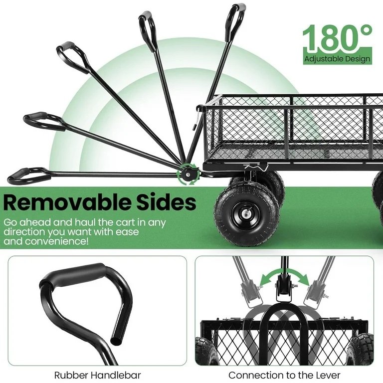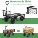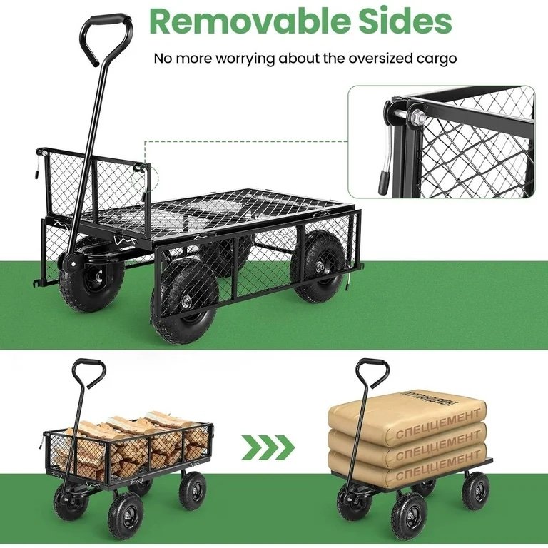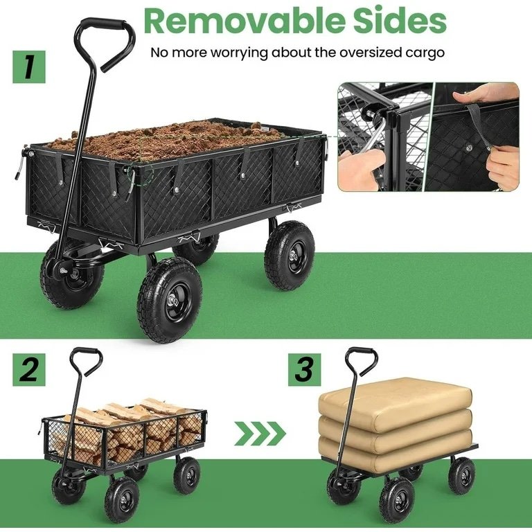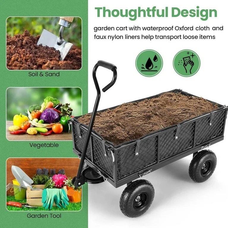【𝐃𝐞𝐭𝐚𝐜𝐡𝐚𝐛𝐥𝐞 𝐝𝐞𝐬𝐢𝐠𝐧】:This heavy-duty garden cart adopts a detachable baffle & Bag design. The mesh baffle can be assembled disassembled from the garden cart, it is convenient to carry items of different sizes. When you carry flower pots and other items, it is best to install the mesh baffle to avoid falling. The Oxford storage bag can be disassembled and installed with snaps, and is suitable for holding small particles such as sand, soil, etc.