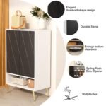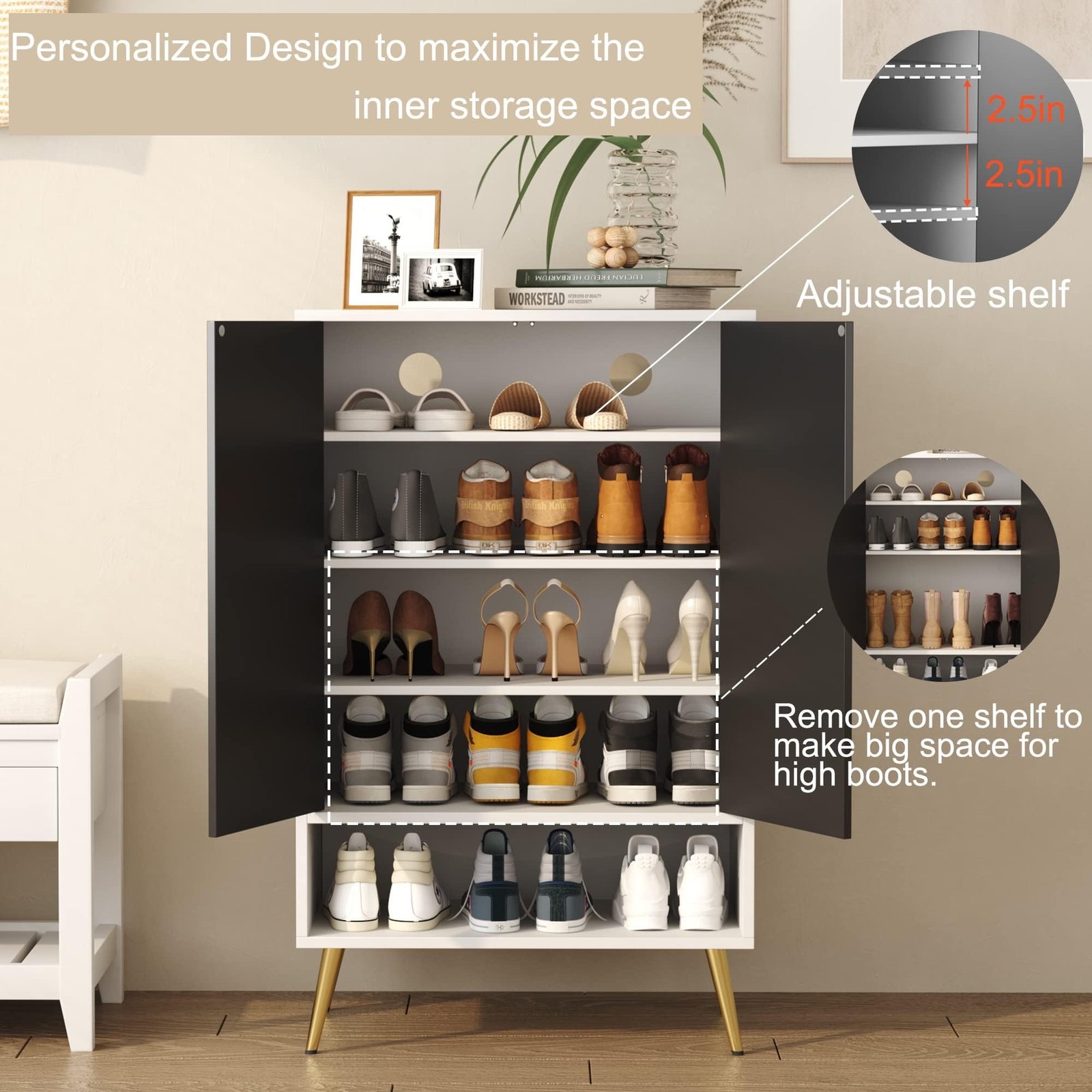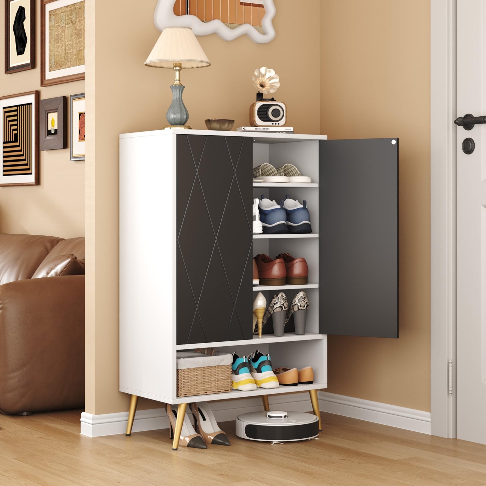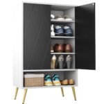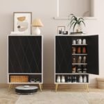 Modern and sleek design: The classic color combination of white and black finish ensures that this shoe dresser fits wherever you place it. Inside the closet, the four internal storage shelves are adjustable to meet the diversifying storage demand to store high boots. With an elegant diamond-shaped design in the cabinet door, you can get an attractive piece of furniture to elevate any living space.