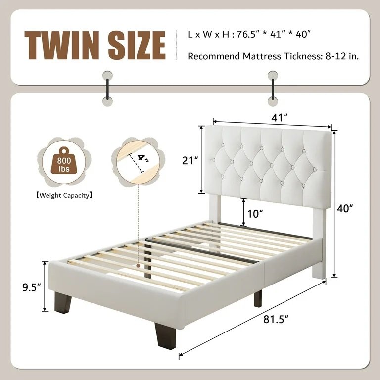 • Dimensions: Twin size bed frame measures 76.5″L x 41″W x 40″H, fitting standard twin mattresses.