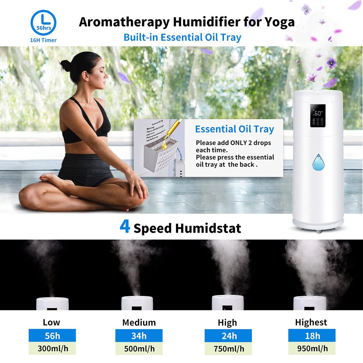 The large humidifier features a 17 liter (4.49 gallon) water tank, with the max high mist output of 800ml/h.