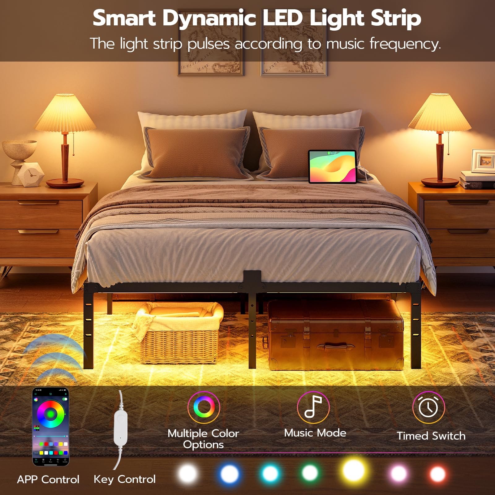 Smart Colorful LED Strip: The smart adjustable LED strip of this bed frame can be controlled via buttons or easily switch colors through an APP. The dynamic lighting dances with music, adding a bright touch and romantic atmosphere to your bedroom