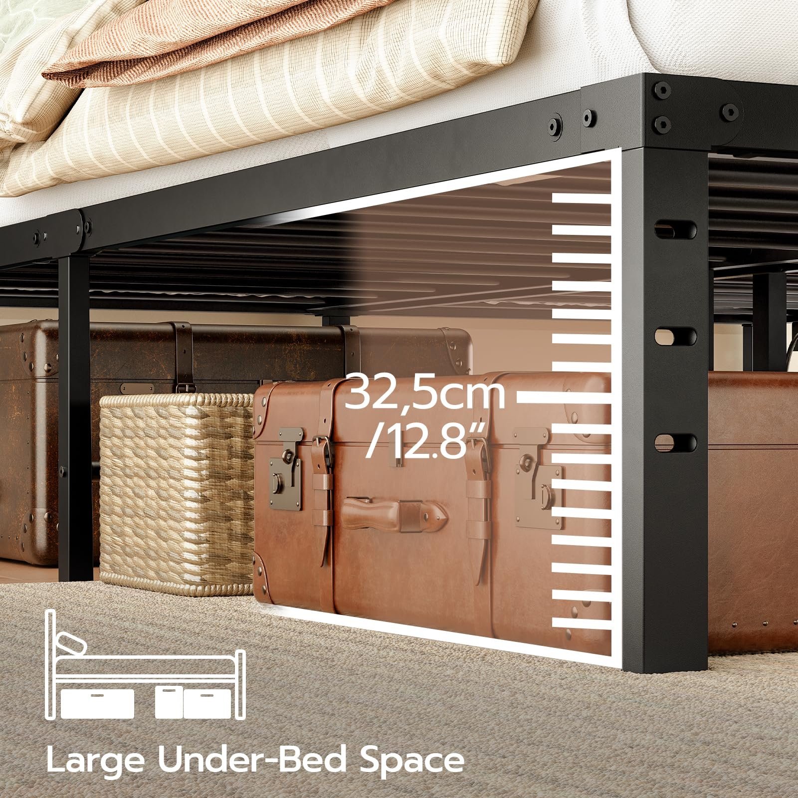 Solid and Stable: This full bed frame boasts upgraded metal bars and legs, standing the test of time. Heavy-duty reinforced metal bars with thicker materials ensure stability and weight-bearing capacity, creating a reassuring sleep space for you