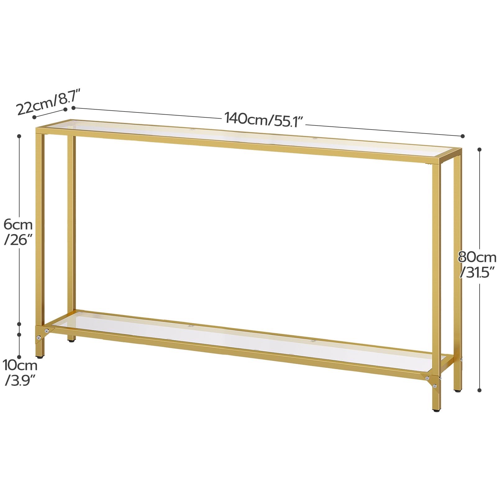 High Bearing Capacity: The gold console table with 4 mm thick tempered glass. The 140 x 22 x 80 cm (L x W x H) glass entryway table can support up to 20 kg, forming a strong support for your favorite artworks, green plants and books