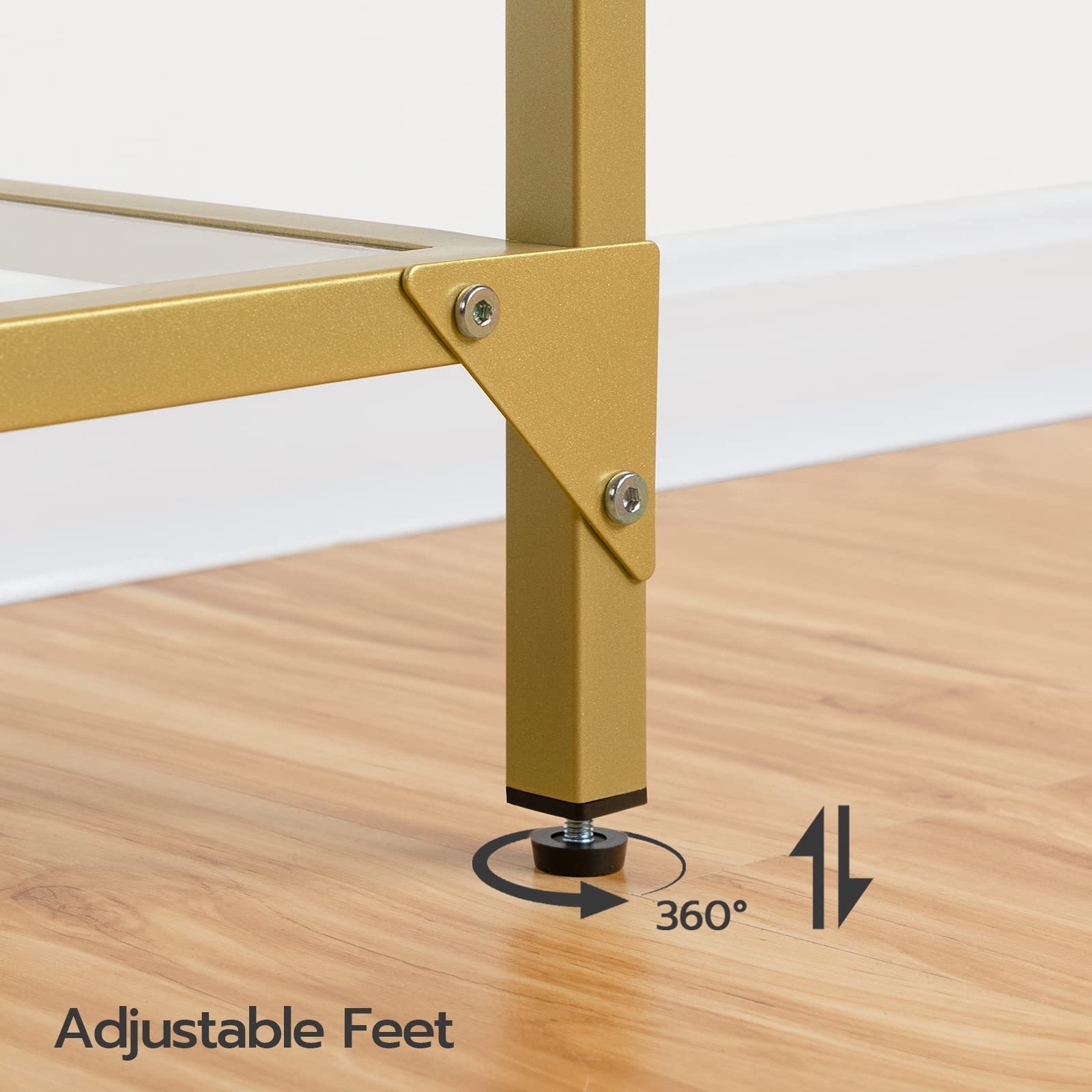 Stop Wobbling For Good: To prevent the glass console table from wobbling due to the uneven ground, the gold entryway table features 4 adjustable feet and additional triangular metal plates to reinforce the frame